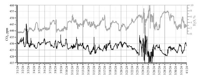 In March 2024, the first regional data on CO2 concentrations for the spring period were obtained (Fig. 9). The carbon dioxide content in March varied in the range of 388.9–445.5 ppm, with an average of 427.5 ppm and a median of 427.8 ppm. The water vapor content varied in the range of 0.2–10.6%, with an average of 3.5% and a median of 3.3%. In general, similar diurnal dependencies are observed for this season of the year.