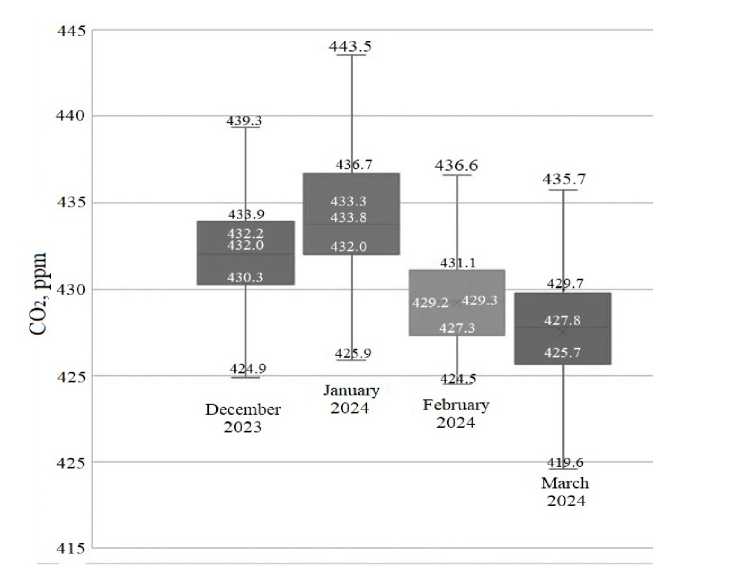 In general, the statistical estimation allows for the discussion of a trend of decreasing carbon dioxide concentrations by March 2024, with a maximum occurring in the middle of the winter season (January 2024). A close relationship has been identified between the temperature regime and the manifestation of daily variability in solar activity. This may also be associated with a change in wind direction during the day/night period. This pattern may be disrupted due to adverse weather events, cyclonic activity and additional emission sources, such as forest fires and grass fires. Further modeling of atmospheric transport will help to identify potential areas – sources of carbon dioxide emissions into the atmosphere.