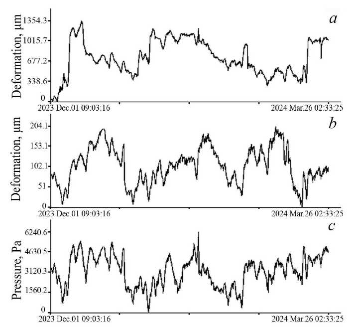 Fig.13. Results of deformation monitoring from December 1, 2023 to March 26, 2024: records of 52.5 m (а) and 17.5 m laser (b) strainmeters, and laser nanobarograph (c)