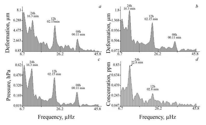 The deformation and gas monitoring data for the period of 1–25 December 2023 were subjected to spectral processing using the periodogram method, with a number of averaging of 3. The data processing results given in Figs. 8 and 13 are shown in Fig. 14.