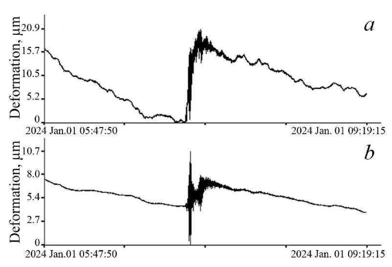 The most remarkable (so far) outcome of the acquired data is the documentation of a tsunamigenic earthquake in the Sea of Japan by laser strainmeters, which resulted in the generation of a tsunami wave reaching up to 0.3 m in height along the Primorsky Krai coastline. Figure 15 shows records of a 52.5 m and 17.5 m laser strainmeters, which registered the earthquake and deformation anomalies (strain jumps) caused by seafloor movements at the epicenter. The earthquake occurred at the northeastern tip of the Noto Peninsula (Japan) on 1 January 2024 at 07:10:09 UTC with a magnitude of 7.6. The level of this deformation anomaly allows for the calculation of the bottom displacement that resulted in the tsunami generation. According to [13], the calculated bottom displacement based on the 52.5 m laser strainmeter recording was 5.4 m at the earthquake epicenter.
