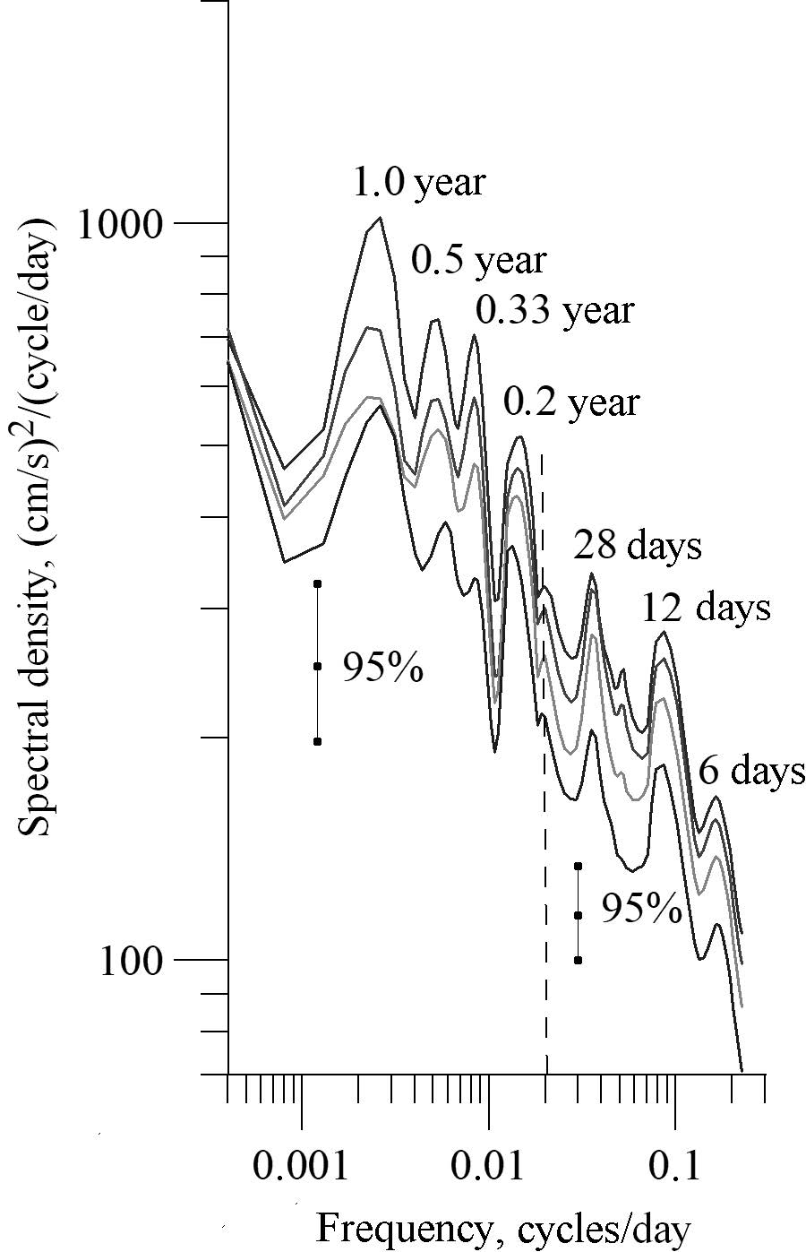 A software module has been developed at MHI for the purpose of spectral analysis. This module has been applied in the context of studies examining energy variability and spatiotemporal characteristics of wind fields, currents, long-wave motions, and internal waves2 [9–10, 15–18]. The essence of the used filter (linear) estimate of the energy spectrum is described in the work3. When processing the statistical characteristics of the vertical distribution of horizontal components of the current velocity, the method of analytical filtering of vector data was used [21]. Vector filtering of time series is also employed to minimize distortions that arise when calculating spectral characteristics in the presence of intense multi-scale oscillations. These oscillations introduce distortions into the estimate of the actual level of spectral energy density in the studied variability range. The paper presents the results of the corresponding calculations of the components and full energy spectra of long-term oscillations of the current vectors. During the analytical processing of arrays of inter-annual variations in the mean annual vector values of currents, obtained synchronously at horizons in the 5–20 m layer, a procedure for centering the mean annual values of vector series was also used. This procedure entailed the component-wise exclusion from the realization of the corresponding values of the mathematical expectation vector, calculated over a 22-year measurement period.