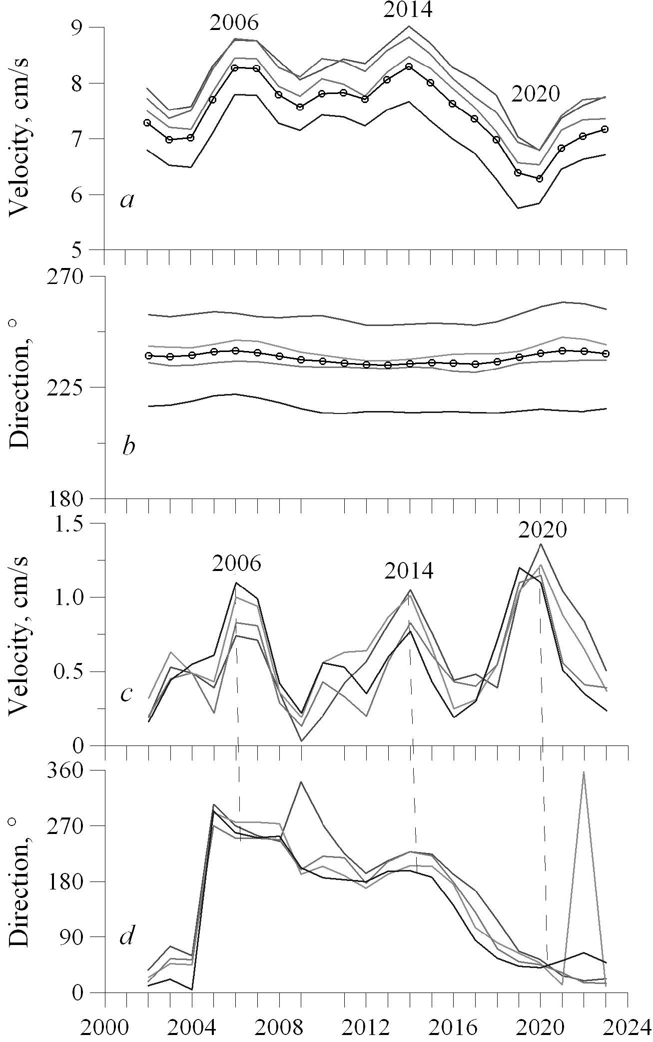 The inter-annual oscillations of velocity modules and directions of the centered current vectors over the periods of ~ 5 and 7 years have values that closely resemble those of each year at all measurement horizons. Vector averaging was performed on the components of the centered current vectors in the 5–20 m layer. Subsequently, smoothed estimates of their integral components were calculated (Fig. 4, b, c). The application of smoothing was implemented in order to minimize the contribution of current oscillations with 5-year periods.