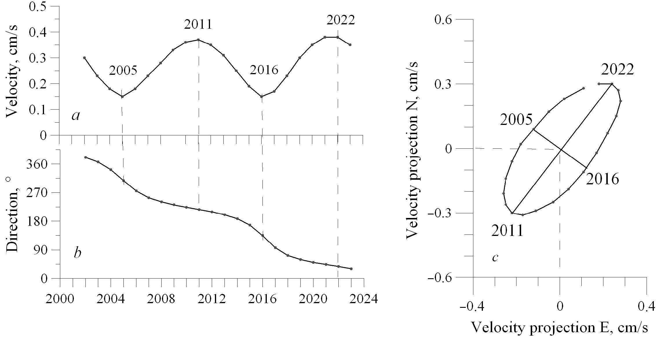 During the vector filtering of 7-year current oscillations in inter-annual variations of smoothed annual average values of velocity module (Fig. 5, a), 11-year oscillations with a complete 360° reversal of the direction (Fig. 5, b) of the centered current vector were identified upon completion of the 22-year measurement cycle. Figure 5, c shows the corresponding ellipse-shaped hodograph with cyclonic rotation of the annual average velocity of the centered current vector. The hodograph, constructed in the right-hand orthogonal coordinate system oriented to the north, demonstrates an almost complete 22-year cycle of current velocity vector rotation for the 2002–2023 period. Axial lines of the ellipse in Fig. 5, c indicate the orientation of the current vector in 2005, 2011, 2016 and 2022 in accordance with the extreme values of the velocity module oscillations (Fig. 5, a).
