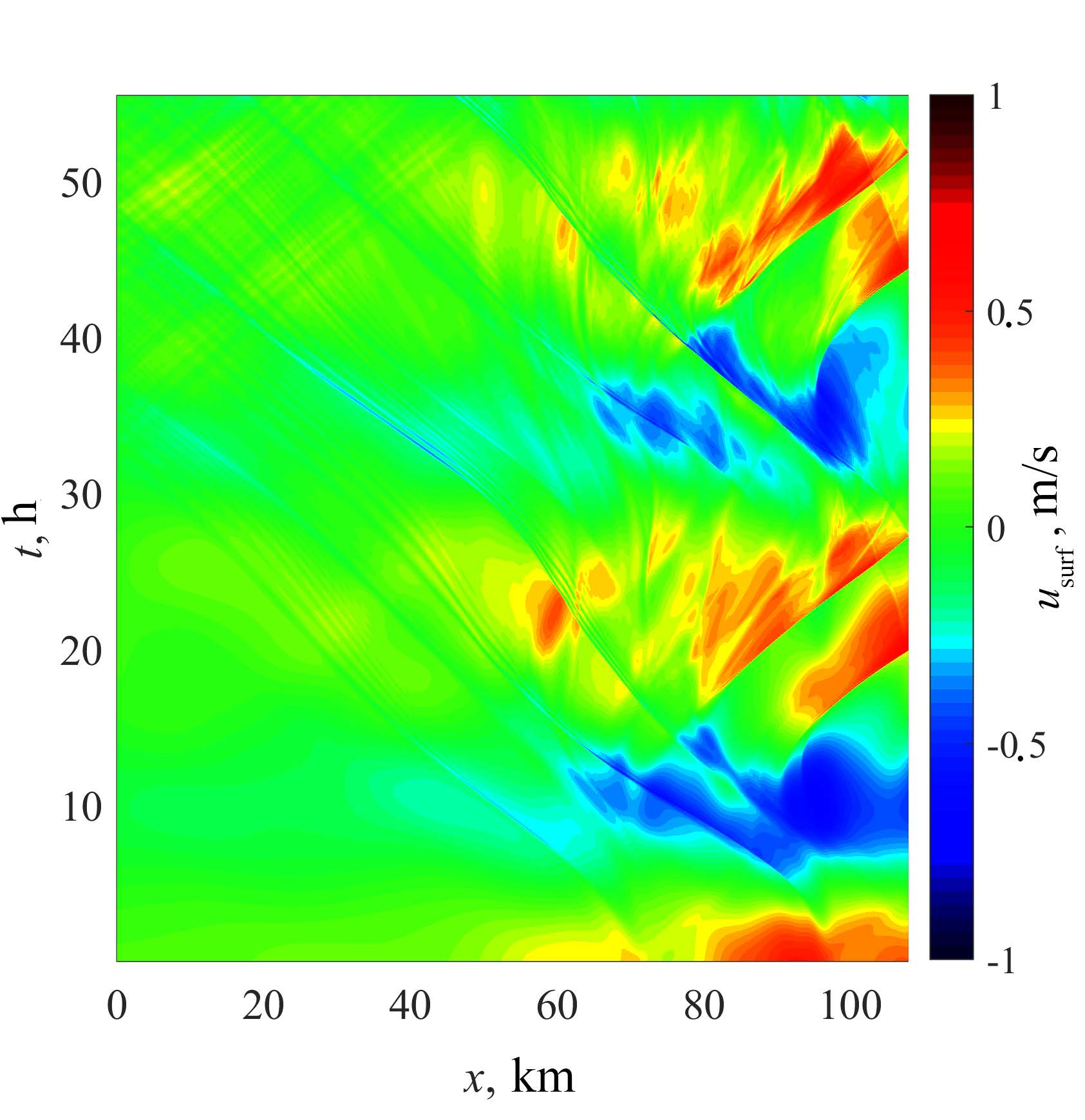 At the first step of the algorithm, the values located on the lines 15 m below the surface and above the bottom were selected from the horizontal velocity field. If we talk about the bottom boundary layer (BBL), its thickness depends on many factors including tidal intensity, bottom slopes and latitudes [18]. A good review of existing empirical models applied for estimating the BBL thickness is given in [19]. It also demonstrates the results of a 15-day observation of the BBL thickness on an area of the continental shelf with a depth of 250 m and sufficiently strong tides (comparable in amplitude to those used in our model). It was revealed that, on average, the BBL was ~ 10 m. We also relied on the BBL estimates obtained by modeling the selected sections using the completely nonlinear nonhydrostatic model for viscous fluids SUNTANS [20]. Although the absence of viscosity in the model we used does not provide a realistic description of the flows arising in the boundary layer, generally, the differences in the wave fields obtained in the inviscid and viscous models will not be significant beyond its limits in subcritical regimes [21]. Guided by symmetry considerations and taking into account that horizon z = −15 m does not fall into the upper pycnocline for all sections, the authors analyzed the velocities at a selected depth of 15 m in the near-surface layer.