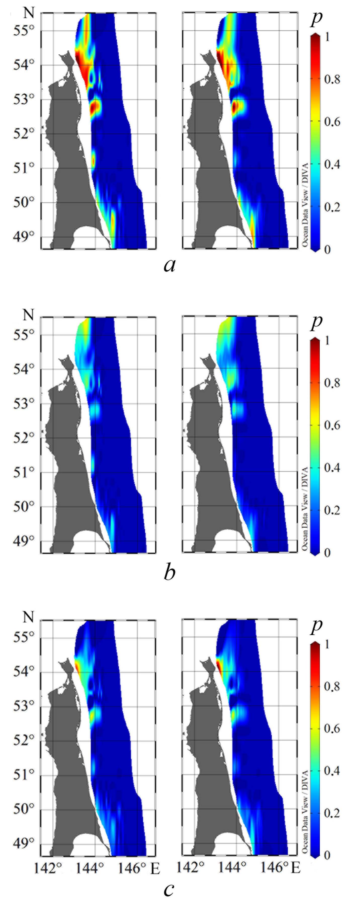 Fig. 5. Maps of probability levels of exceeding 0.25 m/s (p) for the near-bottom (left) and near-surface (right) velocities according to the absolute values (a), directed to the coast (b) and from the coast (c)
