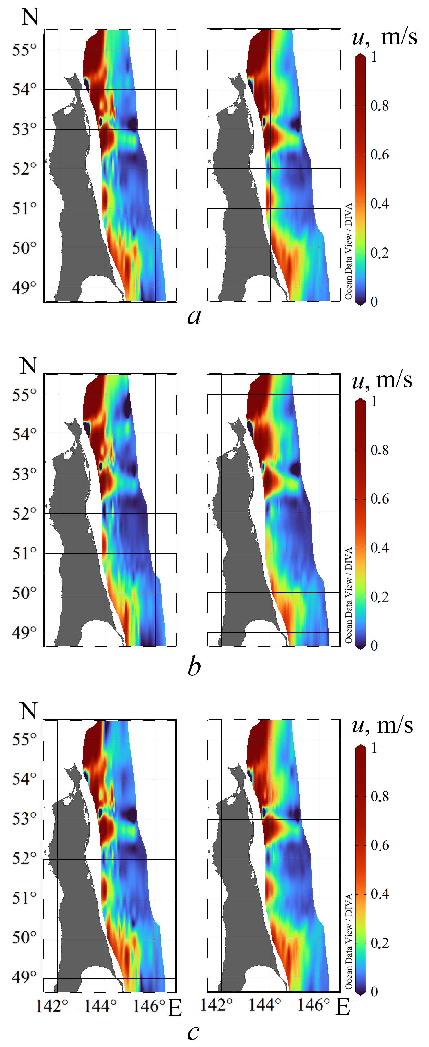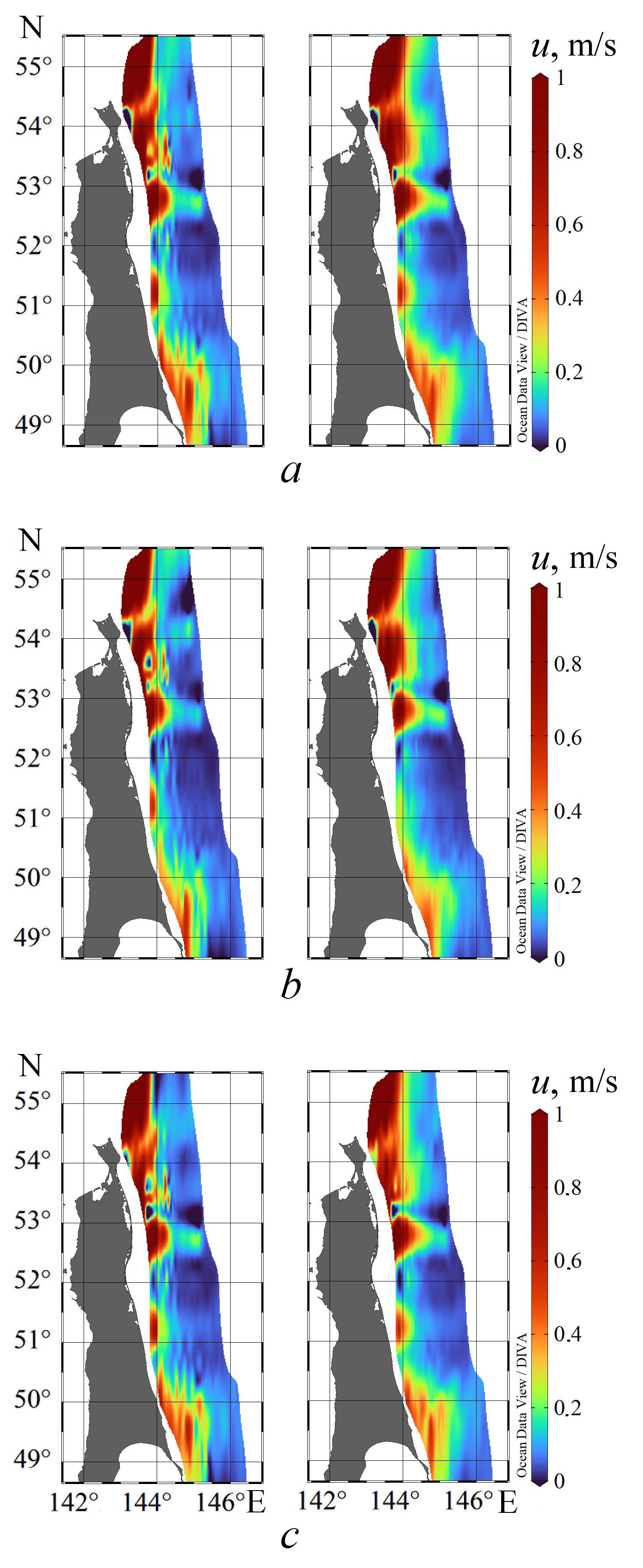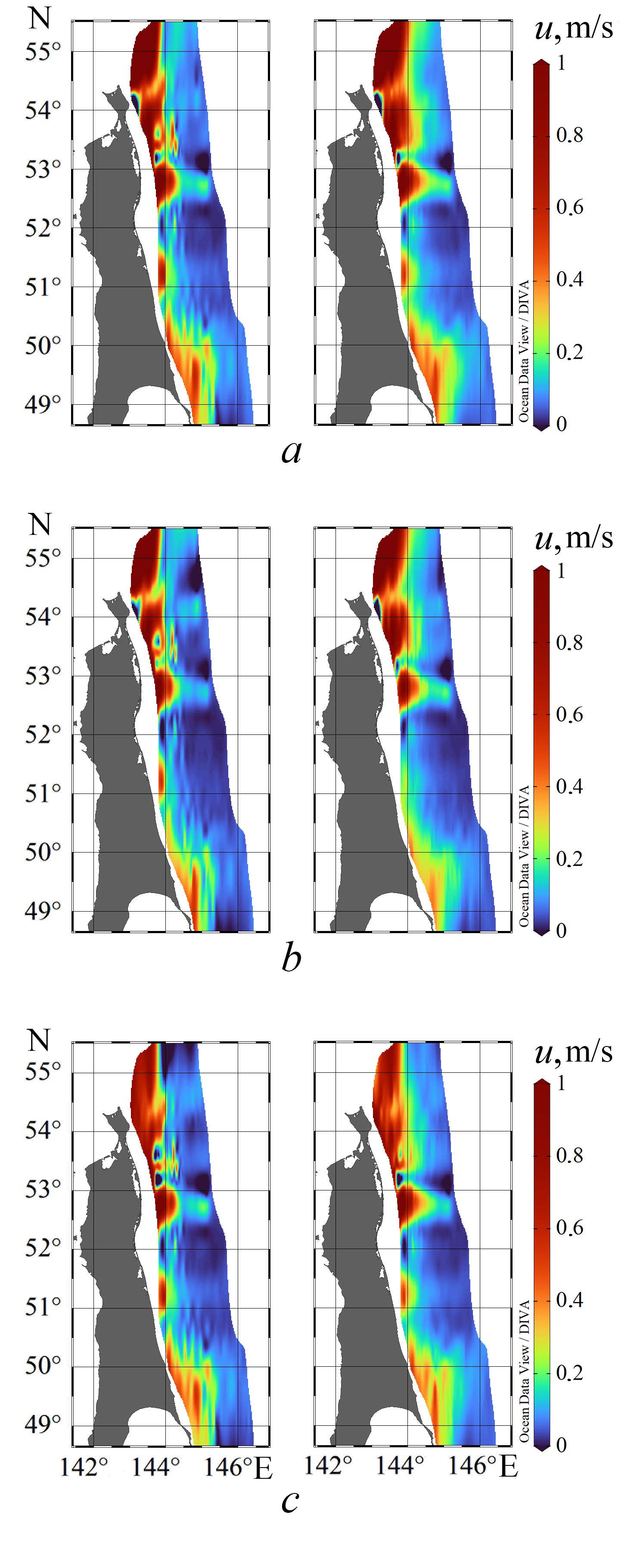 Conclusions. It is shown that the studied shear flows are nonlinear and characterized by significant asymmetry in distribution both in direction (from coast/to coast) and over depth (in the near-bottom and near-surface layers). In the areas where the sea depth is 700–800 m, there is a clearly defined zone where the absolute values of near-surface velocities are several times higher than those of the near-bottom ones. The main zones including the local maxima of velocity field are located in the north – from Cape Elizabeth to Piltun Bay, with one more from Cape Bellingshausen to Cape Terpeniya.