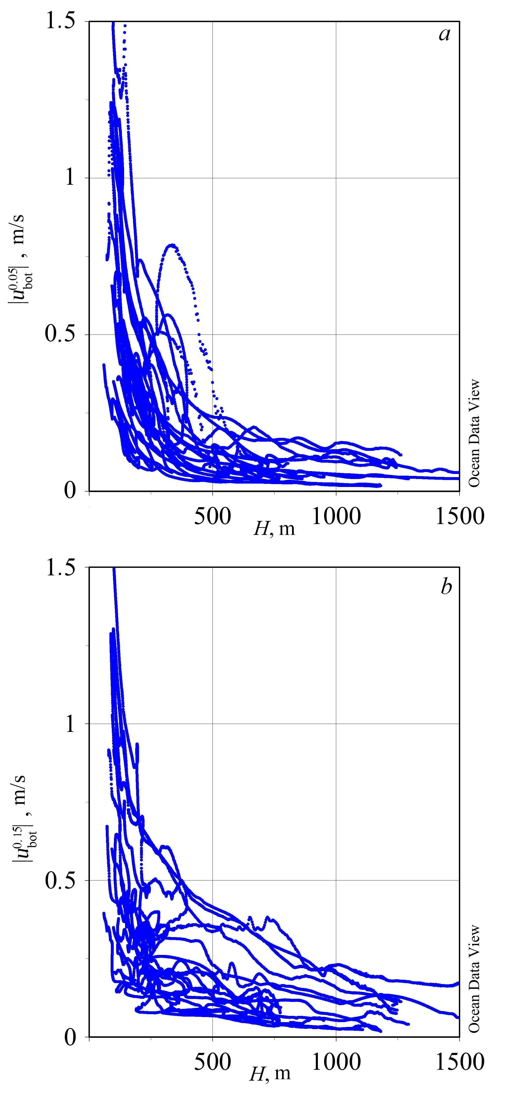 Fig. 11. Dependence of the near-bottom velocity absolute values at a probability level 0.05 (a) and 0.15 (b) upon the total depth at the point