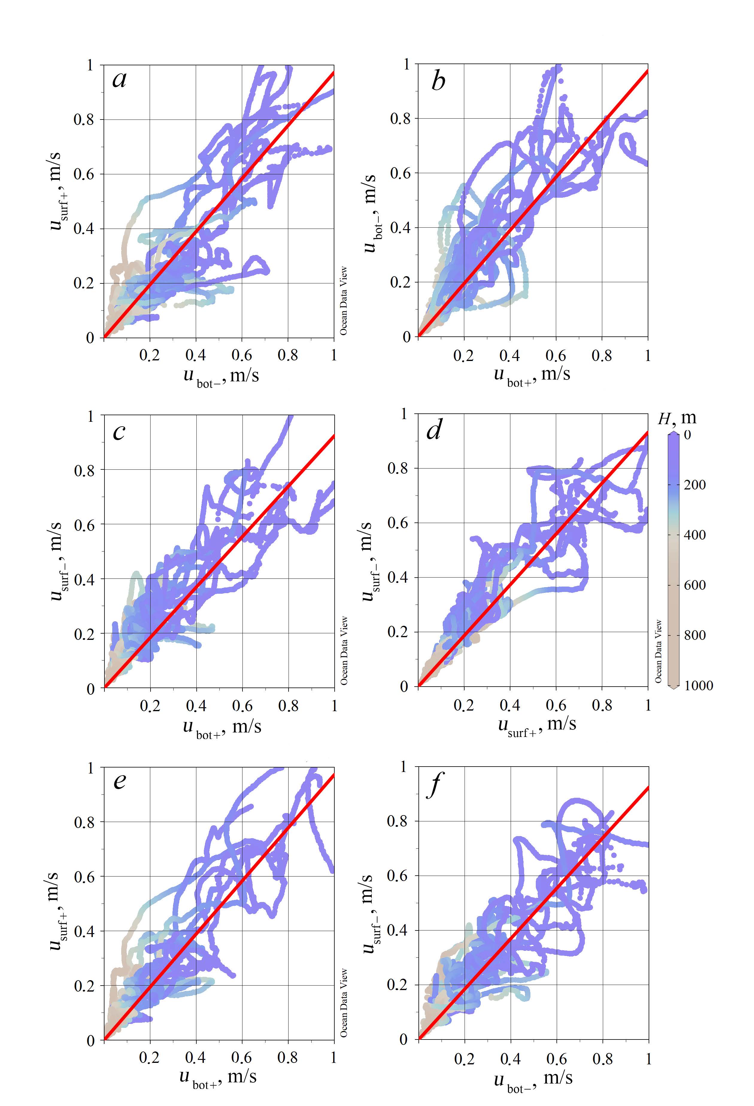 It is shown that the horizontal velocity field is essentially nonlinear: asymmetry is visible both in direction (from coast/to coast) and depth (in the bottom and surface layers). To demonstrate this conclusion, scatter plots of various combinations of the near-bottom and near-surface velocities are also constructed in absolute value and allowing for direction. The maximum scatter of points in all the plots is observed at sea depths of up to ~ 500 m, and values of near-bottom and near-surface velocities over 0.5 m/s are traced at depths of less than 300 m. Consideration of velocity direction and measurement depth (near-bottom/near-surface) leads to an increase in the scatter of points and the width of the point cloud cross-section (especially at values higher than 0.3 m/s), which is apparently associated with a complex nonlinear structure of the horizontal velocity field.