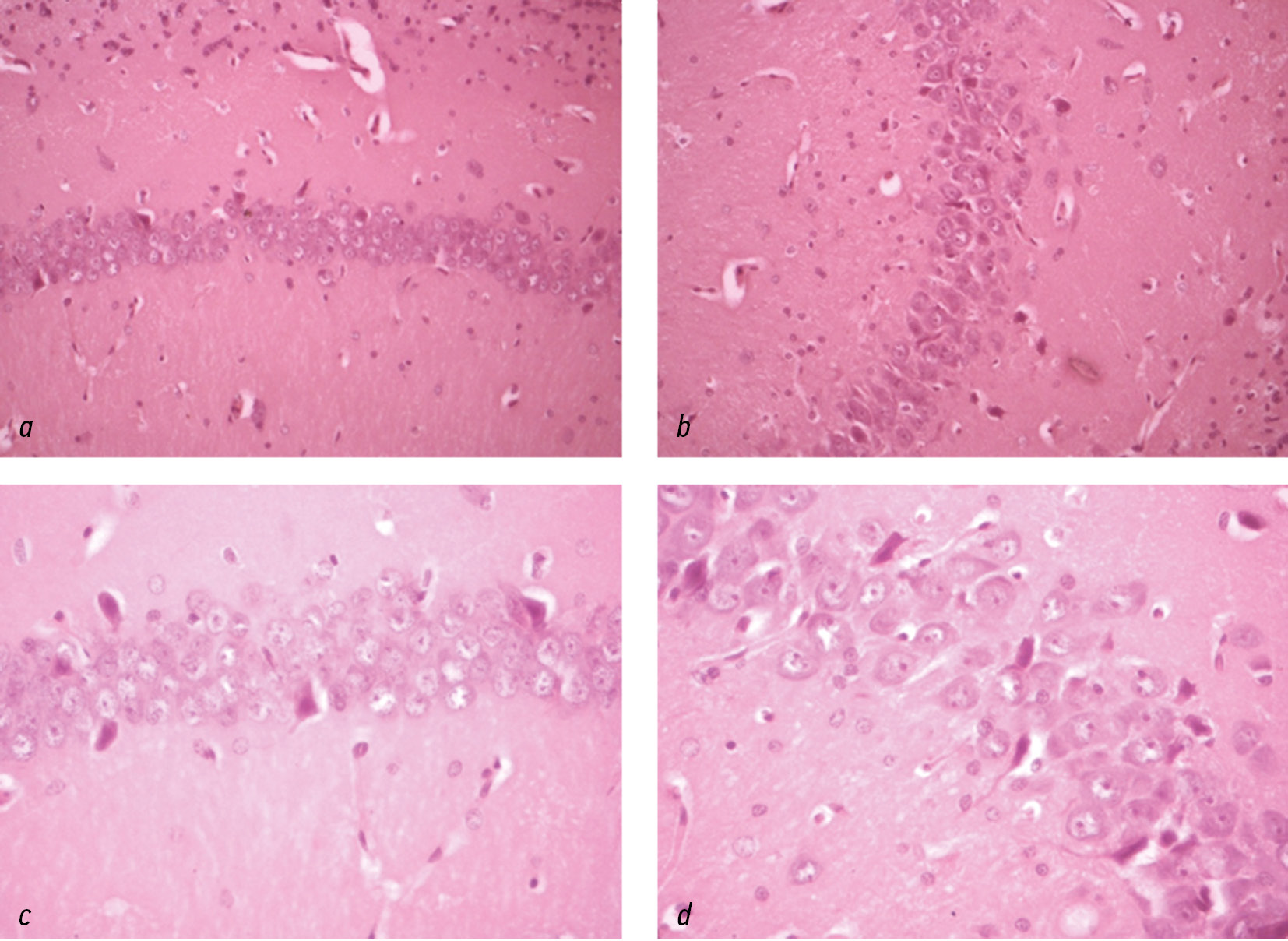 3. Рис. 2. Зоны СА1 (a, c) и СА3 (b, d) полей гиппокампа головного мозга крысы (комбинированное прекондиционирование с амтизолом, ранний период). Гистоархитектоника прослеживается, клеточность относительно сохранена, выраженный периваскулярный, а местами перицеллюлярный отек. В обеих зонах присутствуют единичные нормальные нейроны (больше в поле СА3), а также гиперхромные нейроны, в поле СА1 много клеток-теней и гипохромных нейронов; макроглия сохранена частично; капилляры определяются, но их эндотелий местами отсутствует; появляются единичные клетки микроглии. Окраска гематоксилином и эозином. Увеличение для a, b — ×200, для c, d — ×400