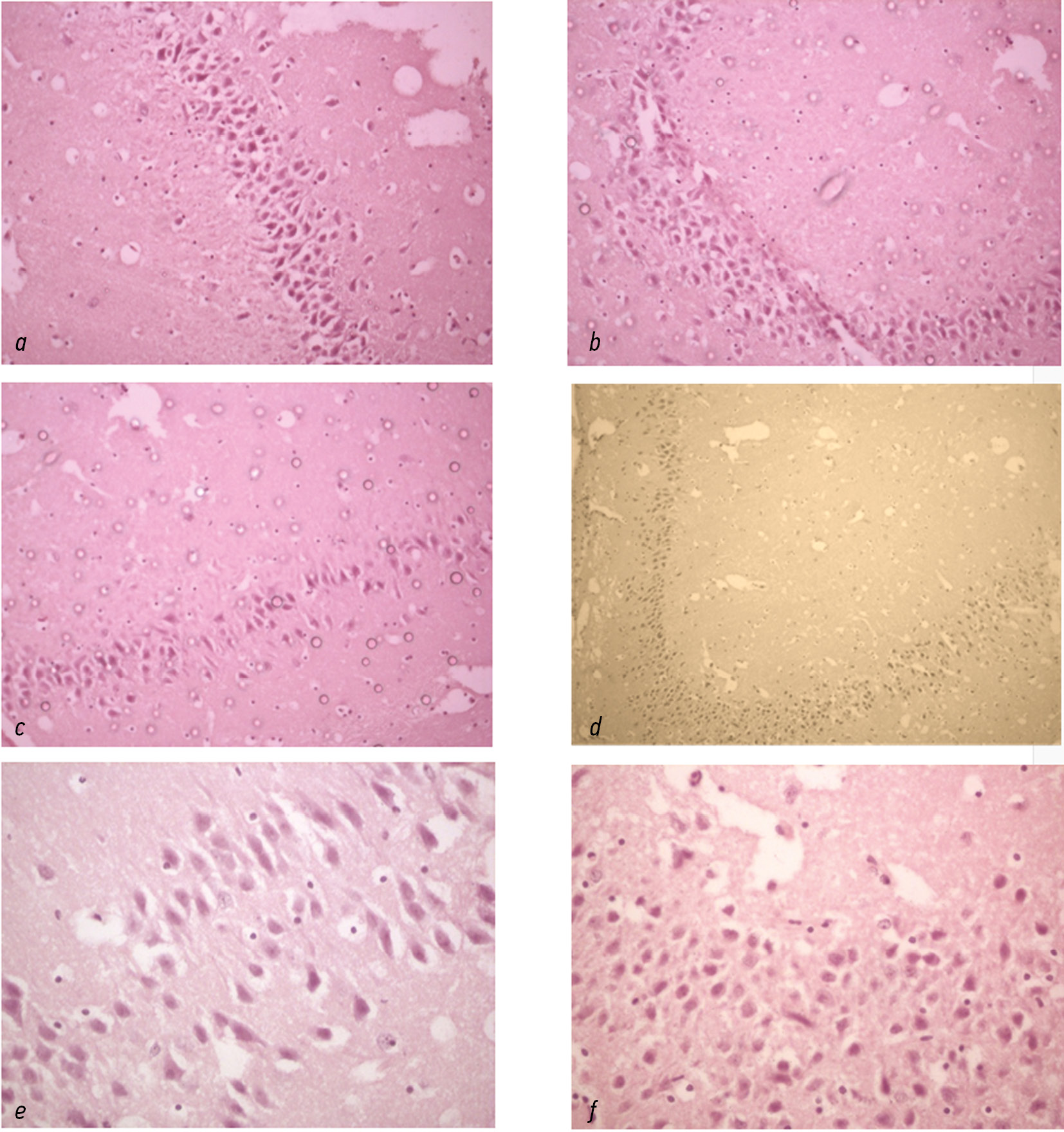 Fig. 1. Zones CA1 (a, c, e) and CA3 (b, d, f) fields of the hippocampus of the rat brain with simulated ischemia. The histoarchitecture is unclear, cellularity is sharply reduced, pronounced pericellular edema, foci of destruction in the brain tissue. e, f: in both zones, there are no normal neurons, and almost all neurons are hyperchromatic, wrinkled, reduced in size, lacking processes; single sharply swollen macroglial cells are detected; capillaries are not detected; maximum number of microglial cells. Hematoxylin–eosin staining. Magnification for a, b, c × 200, for d × 100, for e, f × 400