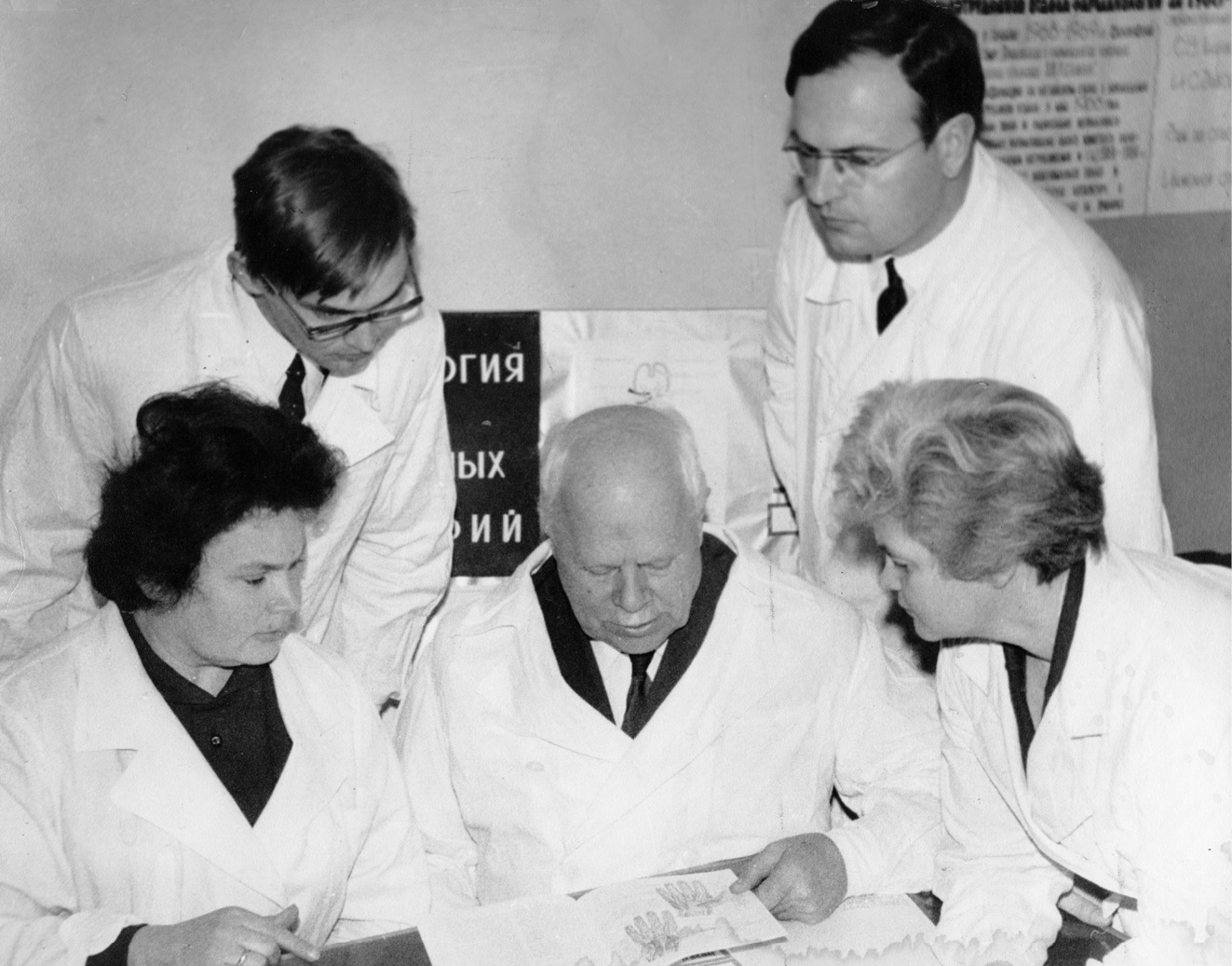 Fig. 4. The authors of the discovery (1971), from left to right sitting: I.S. Zavodskaya, S.V. Anichkov, E.V. Moreva, standing: O.N. Zabrodin, V.V. Korkhov