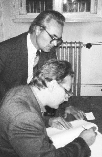 Fig. 9. Professor N.S. Sapronov (standing) and P.D. Shabanov, Senior Researcher, Candidate of Medical Sciences, writing a scientific article (1989)