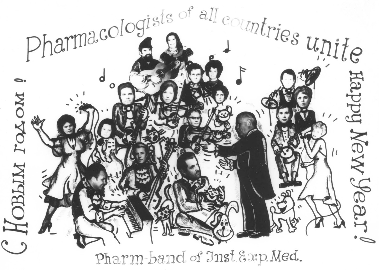 Хотелось бы отметить, что в отделе фармакологии не только занимались научными исследованиями, но и умели отдыхать. Например, в канун Нового года, на дни рождения устраивались так называемые капустники, костюмированные представления. В сценарии праздника в шутливой форме отражались основные события и достижения Отдела и института (рис. 10). С.В. Аничков любил праздники, очень ценил шутки и капустники. К новому году выпускались открытки. На рис. 11 новогодняя открытка с дружеским шаржем на сотрудников отдела — оркестр под управлением дирижера С.В. Аничкова.