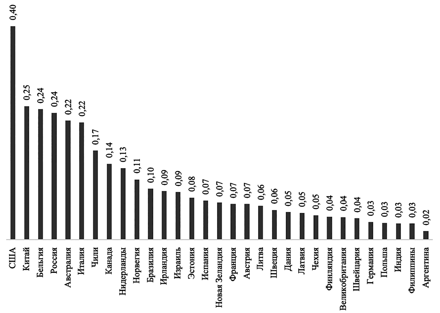 Самая высокая доля занятых во фрилансе обнаружена в США (40%), на втором месте Китай (25%), далее – Бельгия (24,44%) и на четвертом месте – Россия (23,75%). При этом можно классифицировать наблюдаемые страны мира по трем группам: с долей занятых во фрилансе более 20% (от 10 до 20%) и менее 10% (рис. 2). Наиболее многочисленную группу составили страны с долей занятых во фрилансе менее 10%, например, Бразилия (9,52%), Франция (6,67%), Германия (3,33%) и Аргентина (1,58%).