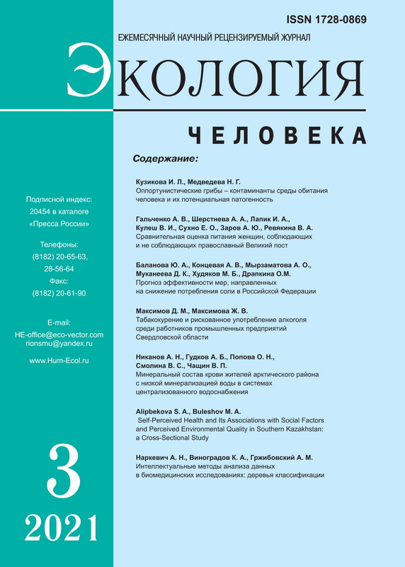 Введение. Минеральный состав питьевой воды сильно отличается между городами и может оказывать влияние на минеральный состав крови населения. Цель: оценить минеральный состав крови жителей, проживающих в районах с низкой минерализацией воды из подземных источников, распределяемой системами централизованного водоснабжения в Арктической зоне России. Методы. Исследование проводилось в г. Кировске Мурманской области. В исследовании приняли участие постоянные жителя в возрасте от 18 до 23 лет, постоянно проживающие изучаемом районе. Определение химических элементов в воде и цельной крови выполнено методом атомно-эмиссионной спектрометрии. Анализировалось содержание Ag, Al, As, B, Ba, Be, Ca, Cd, Co, Cr, Cu, Fe, K, Mg, Mn, Mo, Na, Ni, Pb, Sb, Se, Si, Sn, Sr, Ti, Tl, V, Zn, Y. Результаты. Водопроводная вода в г. Кировске имеет повышенный водородный показатель, с общей минерализацией 65,0 мг/л (при ПДК 1 000 мг/л): содержание магния ниже физиологического уровня в 1 000-1 500 раз, а кальция - в 150-300 раз. Концентрация алюминия превышает ПДК в 1,3-1,5 раза, по остальным элементам - в десятки и сотни раз ниже ПДК. В крови содержание кальция несколько ниже средней величины для здоровых людей, а магния - соответствует нормальным значениям. Выявлено высокое содержание бора (2,45 ± 0,11) мг/л. Выводы. У жителей, проживающих в районе с низким уровнем общей минерализации водопроводной воды, выявлено снижение содержания кальция, но не магния в цельной крови. Не обнаружено высоких концентраций тяжелых металлов. Несмотря на высокий уровень содержания алюминия в воде, его концентрации в крови находятся в пределах физиологической нормы. Повышенное содержание в крови бора требует дальнейшего изучения.