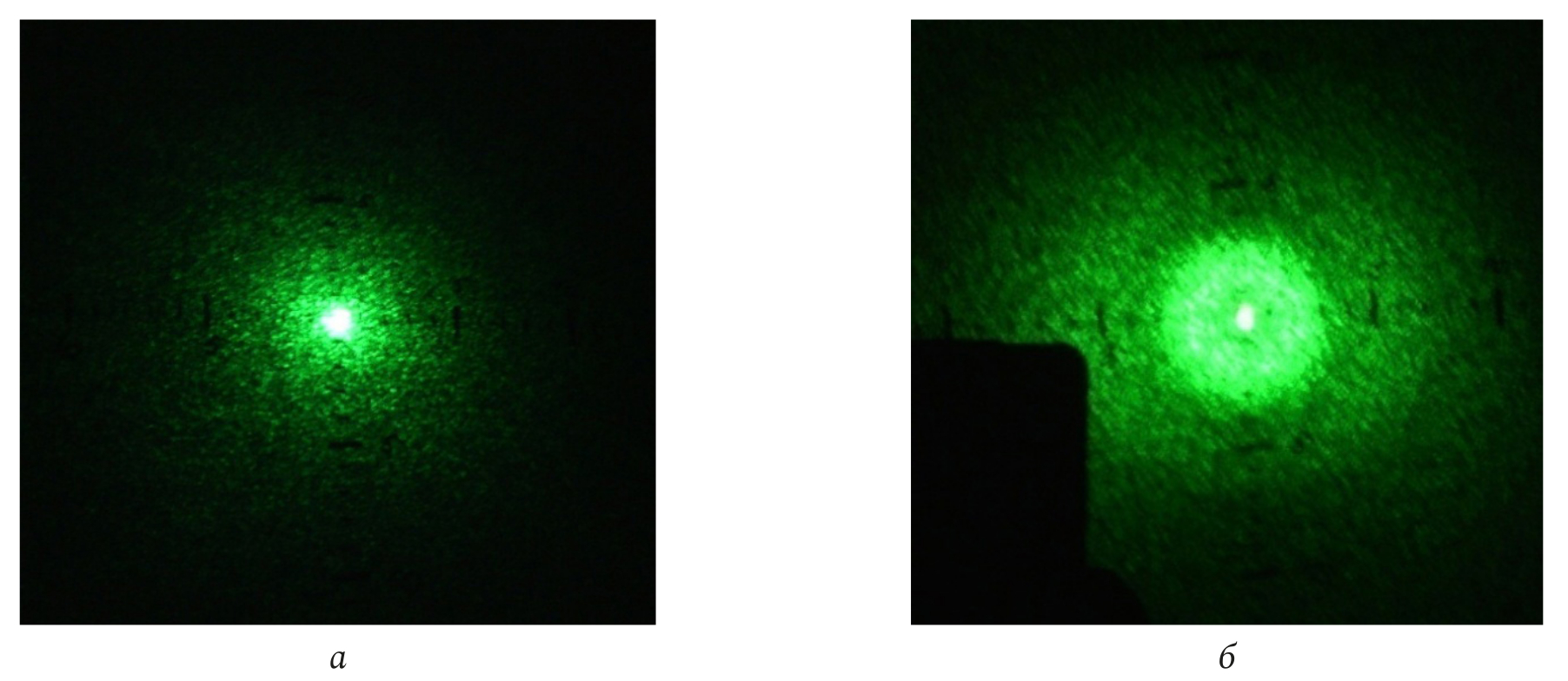 При охлаждении вблизи критической точки на экране наблюдается регулярная кольцевая структура, характерная для дифракции Фраунгофера на круглом отверстии (рис. 2, б).