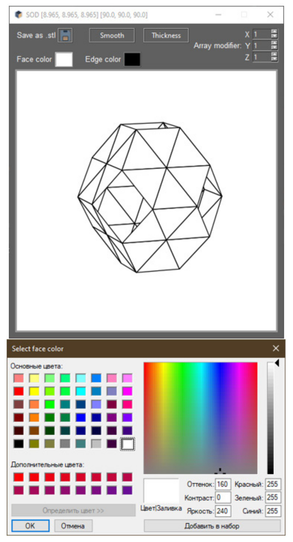Разработанный графический интерфейс предоставляет возможности просмотра (вращение и увеличение масштаба) созданной 3D-модели, а также для удобства просмотра, имеются возможности цветовой настройки фасетов и граней фигуры, как показано на рис. 2, 3.