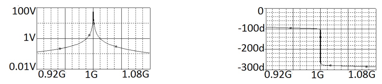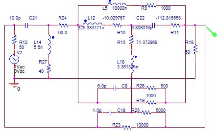 Рис. 11. Эквивалентная схема (а), узкополосного усилителя (рис. 9), соответствующего первой структурной схеме (рис. 1, а). АЧХ- и ФЧХ-усилители, полученные в системе OrCad, показаны на рис. 12