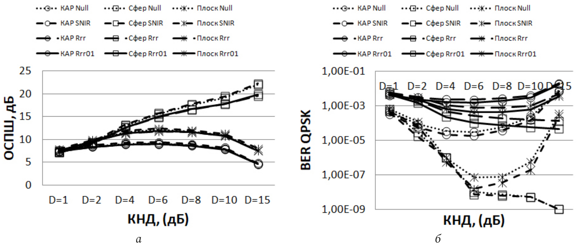 На графиках из рис. 2, б показаны вероятности битовой ошибки рассматриваемых антенных решеток и алгоритмов диаграммообразования в зависимости от направленности элементов. Из рис. 2 видно, что кривые а и б взаимно обратные. Так, к примеру, битовая ошибка полусферных решеток снижается от 10-3 до 10-9 с увеличением КНД антенн. При этом использование АР цилиндрической и планарной геометрий вызывает волнообразный характер изменения появления ошибок QPSK-сигнала, т. е. колебание в пределах 10-3 до 10-5 для ЦиАР и 10-3 до 10-8 для плоской АР.