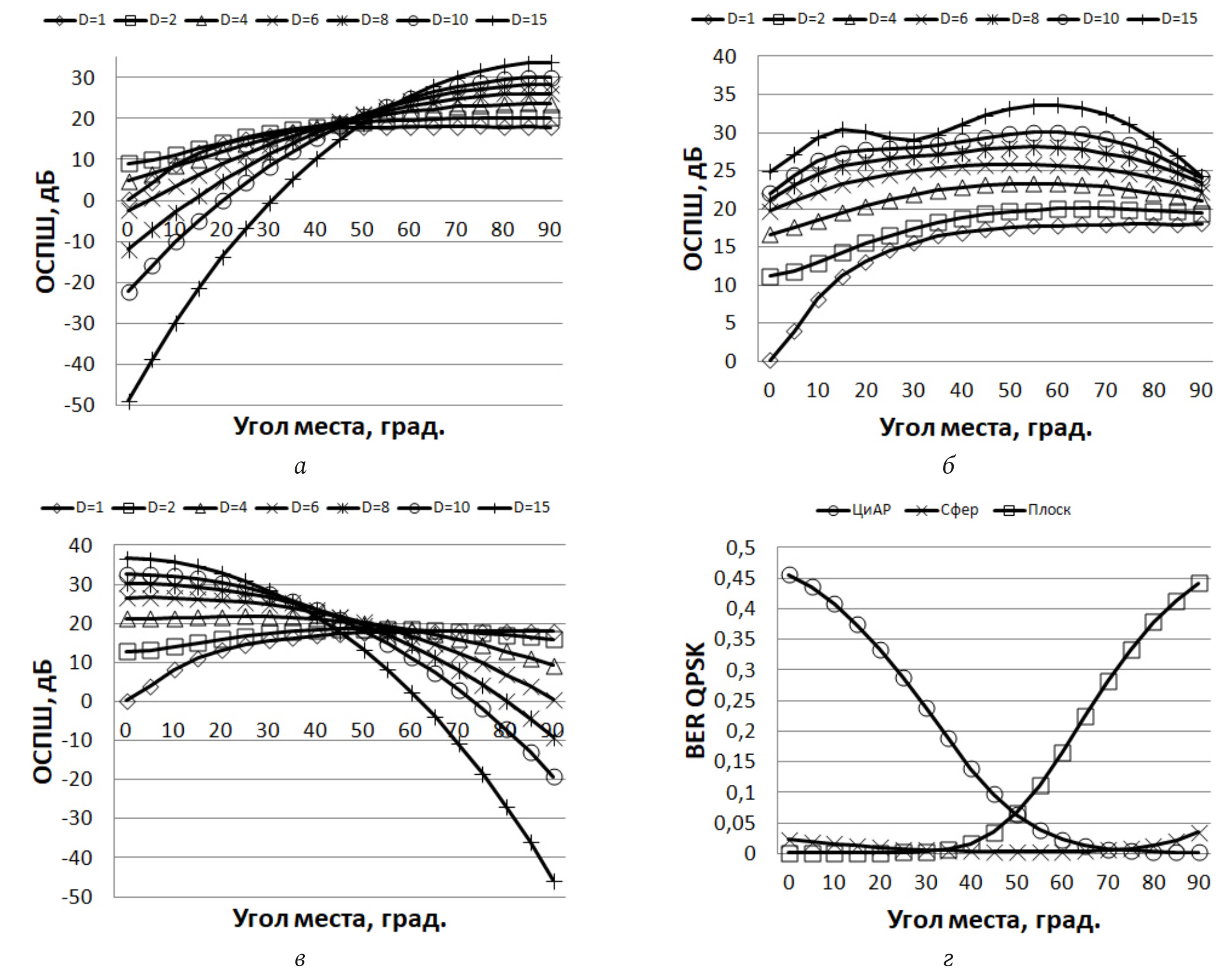 Рис. 3. Отношение мощности полезного сигнала к сумме мощностей помехи и шума на выходе ЦАР в зависимости от направления на источник по углу места и КНД отдельного элемента для: а – кольцевой АР; б – полусферной АР; в – плоской АР; г – вероятность битовой ошибки, D = 6 дБ