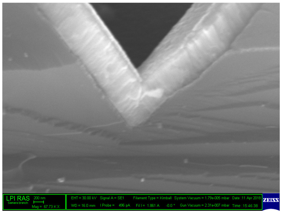 Рис. 2. РЭМ поперечного зеркального скола структуры возле стыка пирамид с пленкой фторида диспрозия