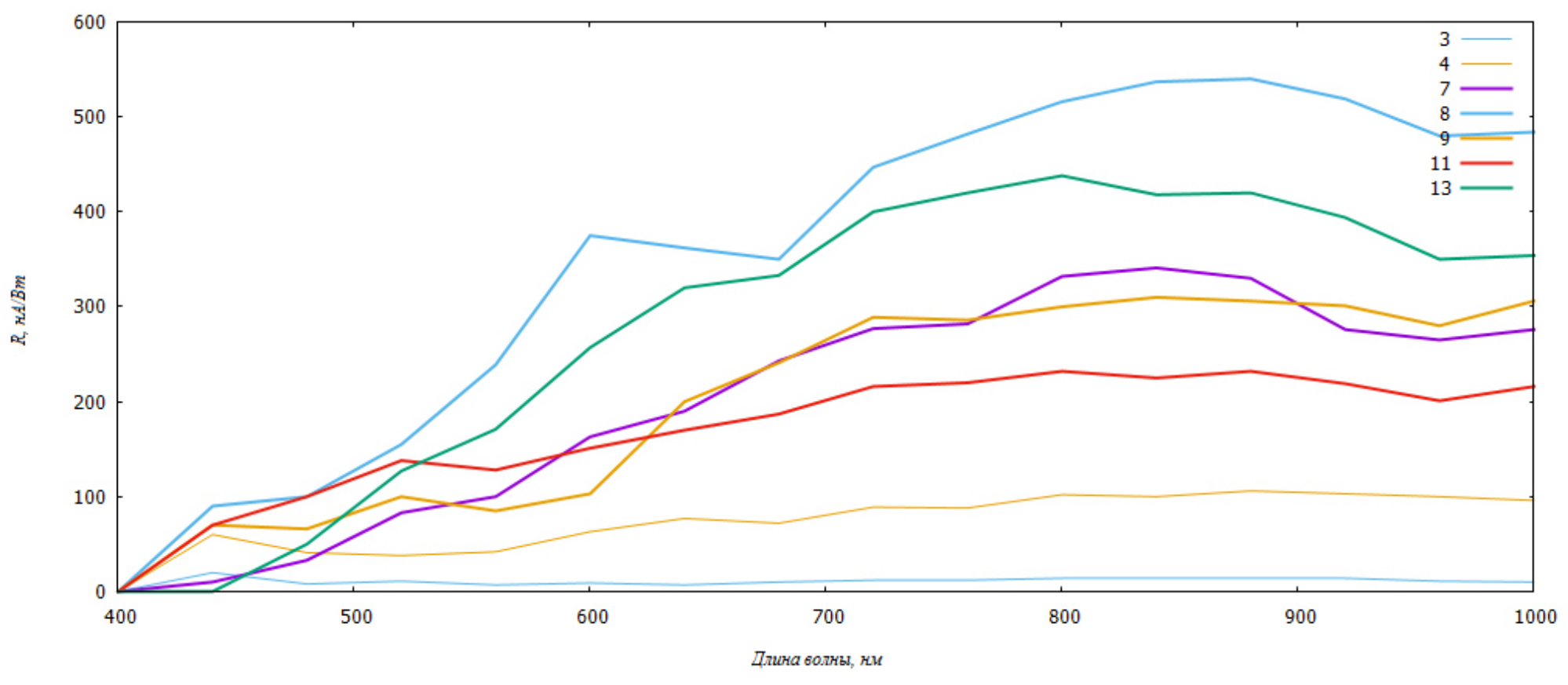 Наиболее эффективной оказалась толщина пленки 0,1 мкм, позволившая значительно увеличить фоточувствительность образца. Наибольшей фоточувствительностью обладает образец № 14, превышающий другие образцы в более чем в десятки раз (20 000 нА/Вт от 700 до 850 нм).