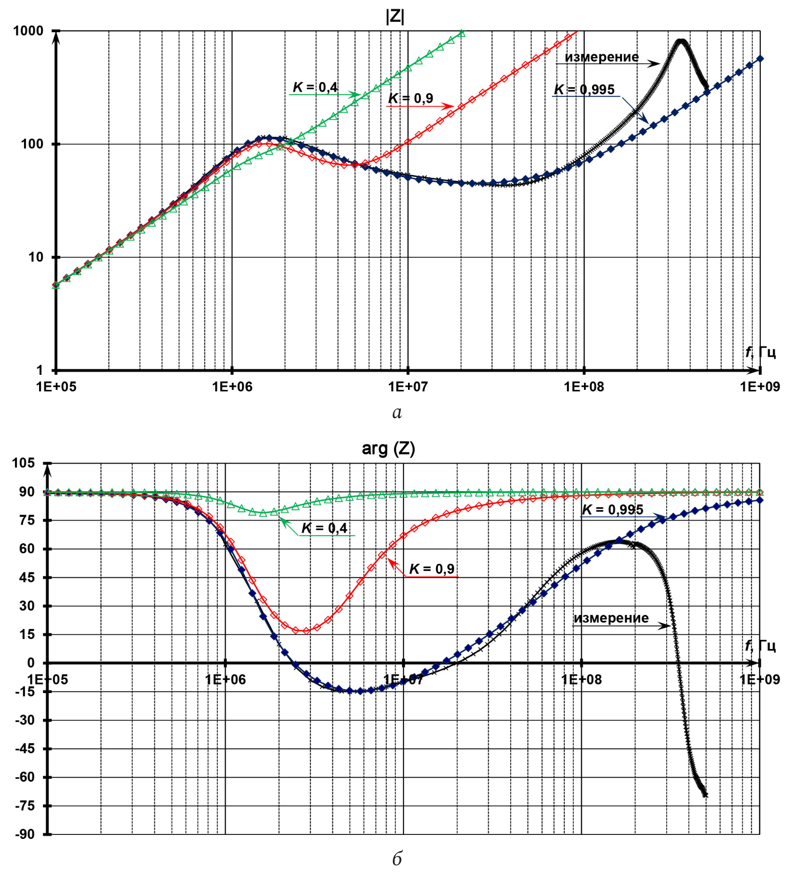 Рис. 7. Модуль (а) и фазы (б) комплексного сопротивления диэлектрика: измеренное значение в сравнении с рассчитанным по схеме замещения (рис. 6)