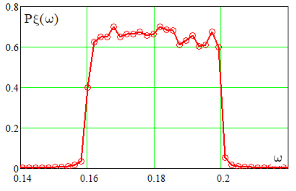 В уравнение (1) введено внешнее воздействие в виде фильтрованного дискретного белого шума с амплитудой Полоса фильтрации в окрестности частоты имеет порядок Оценка спектральной плотности мощности (СПМ), вычисленная методом периодограмм Бартлетта c 512-точечным преобразованием Фурье по реализации длиной N = 262144, показана на рис. 1. Результатом полосовой фильтрации также является то, что первоначальное вероятностное распределение значений шума становится нормальным.