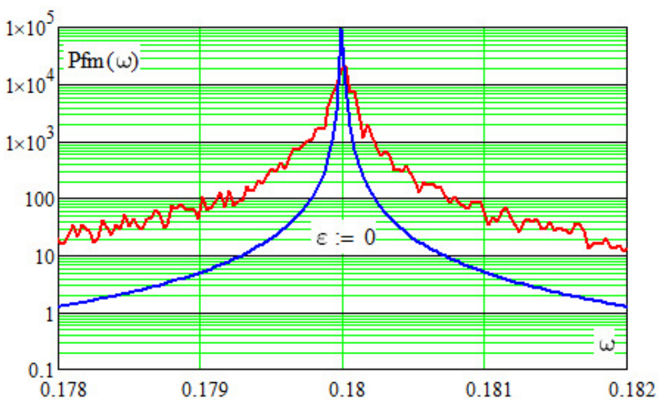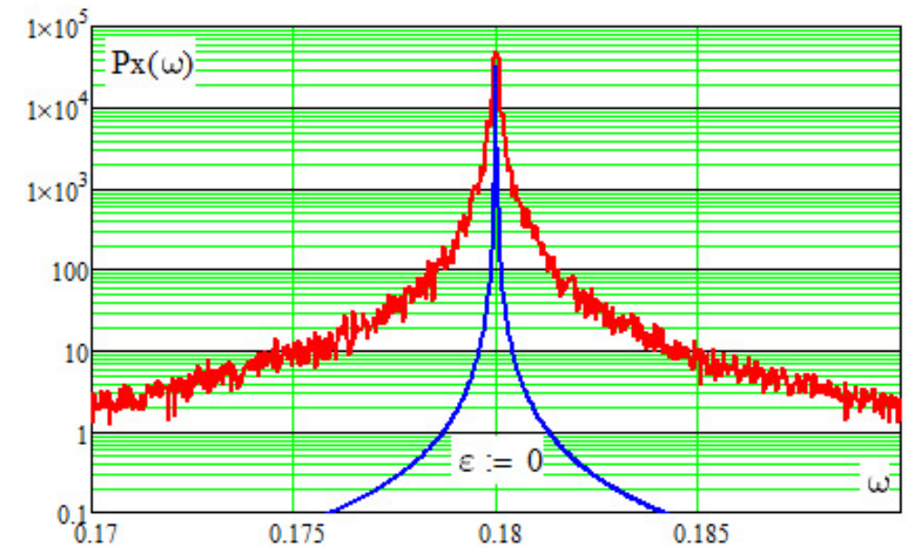Следует отметить, что при практическом спектральном анализе необходимо учитывать уширение спектральных линий из-за конечности длины обрабатываемой реализации (вклад временного окна). На рис. 4 в логарифмическом масштабе наряду со спектральной линией в анализируемой модели приведена оценка СПМ ДВ-генератора (1) без внешнего шумового воздействия Как видно из рис. 4, вклад временного окна в уширение спектральной линии при оценивании с 32768-точечным преобразованием Фурье пренебрежимо мал.