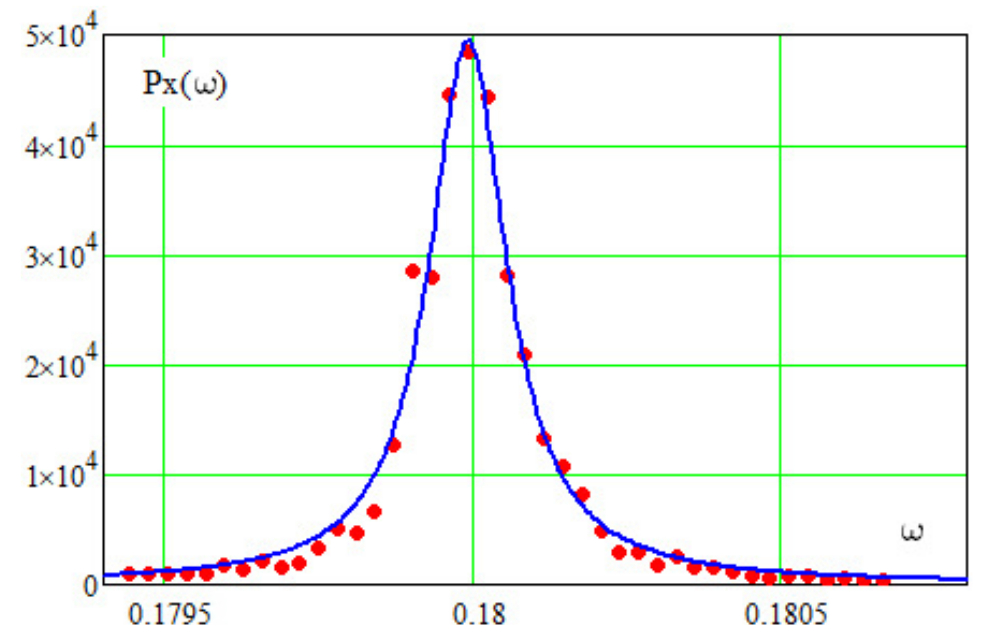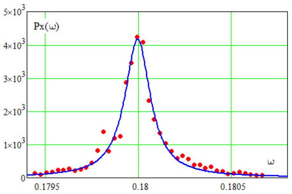 Для выявления эффекта уширения спектральной линии проведены оценки СПМ методом усреднения периодограмм Бартлетта. Оценка, выполненная по реализации длиной c 32768-точечным преобразованием Фурье, показана на рис. 3 точками. Непрерывная линия – это аппроксимация СПМ методом наименьших квадратов с помощью лоренцева форм-фактора: