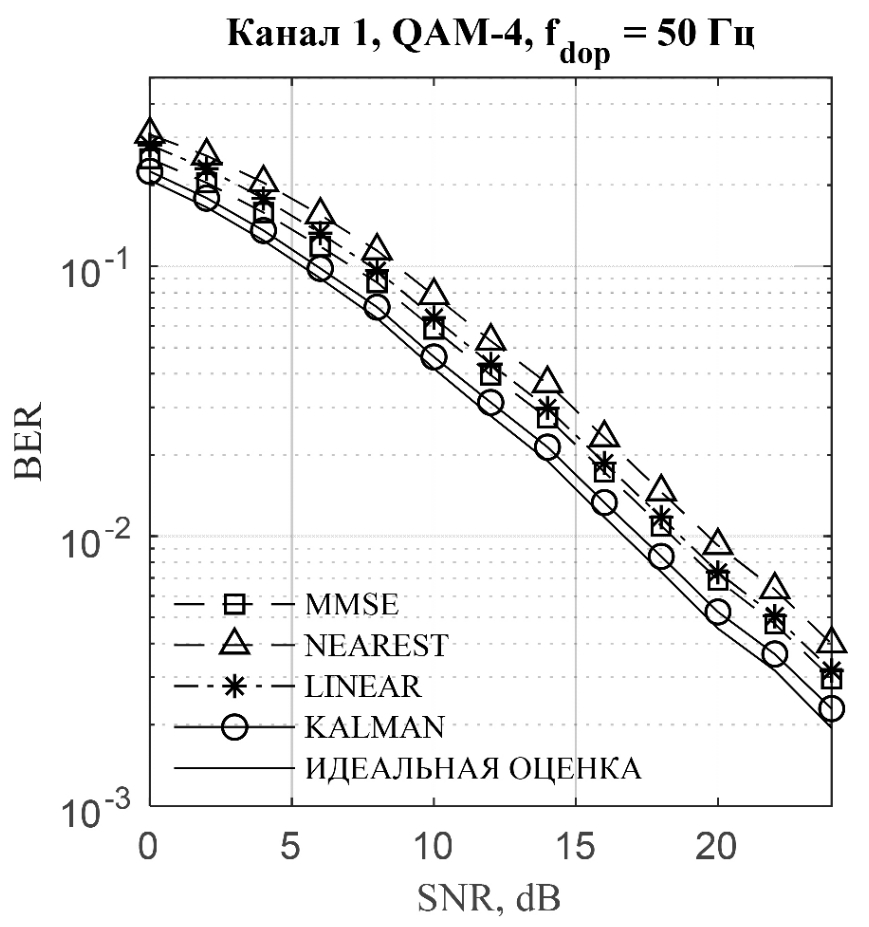 В канале 2 с повышением частоты фединга практически ничего не поменялось. Так как одна реализация сигнала и шума обрабатывалась разными алгоритмами, можно сделать вывод, что эффективность алгоритма Калмана с повышением частоты ухудшилась: в первом случае разница в помехоустойчивости по сравнению с идеальной оценкой канала составляла 0,5 дБ, а во втором – 0,7, тогда как MMSE-алгоритм не демонстрирует такого эффекта. Соответствующие кривые изображены на рис. 5 и 6.