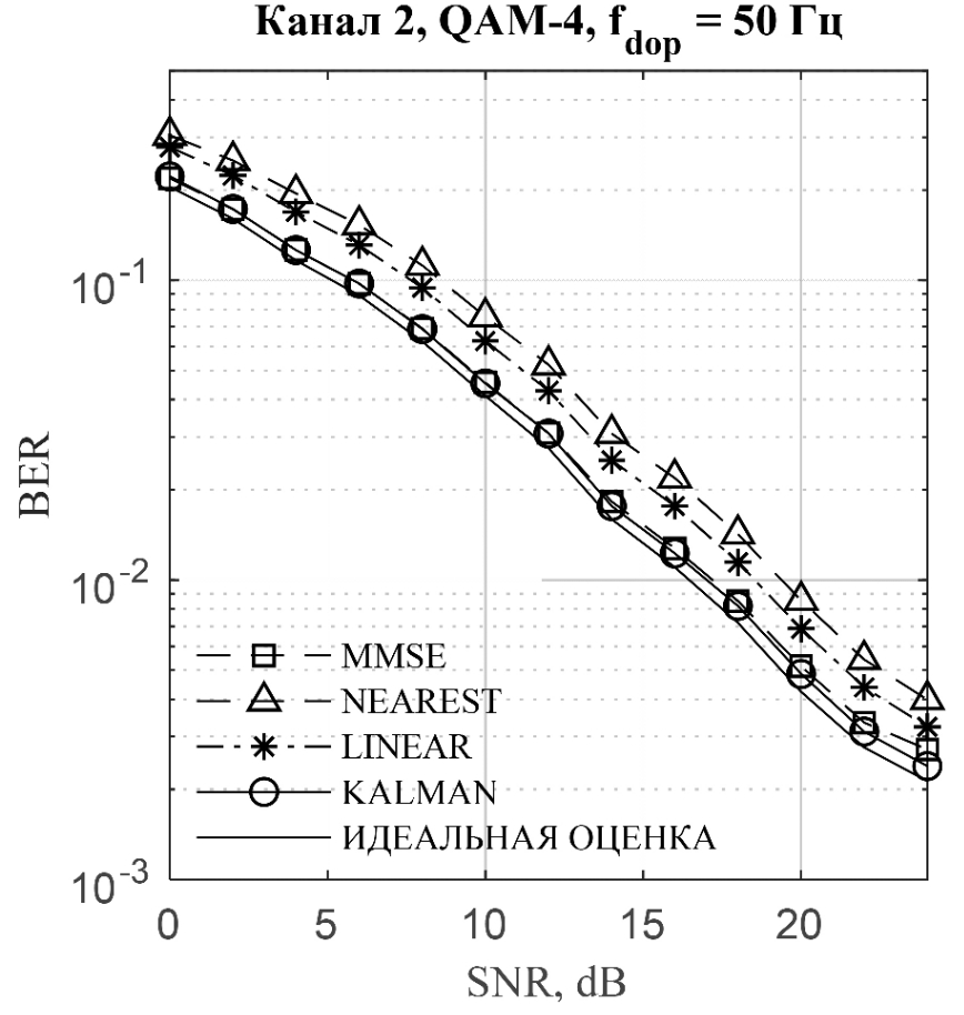 Для модуляции QAM-16 в канале 2 с повышением частоты Доплера эффективность фильтра Калмана относительно алгоритма, использующего идеальную оценку, как и в системе с модуляцией QAM-4, уменьшилась. Так, разница в рабочем отношении сигнал/шум между этими методами увеличилась с 0,5 до 1,4 дБ, а относительно MMSE-алгоритма уменьшилась с 0,3 до 0,1 дБ.