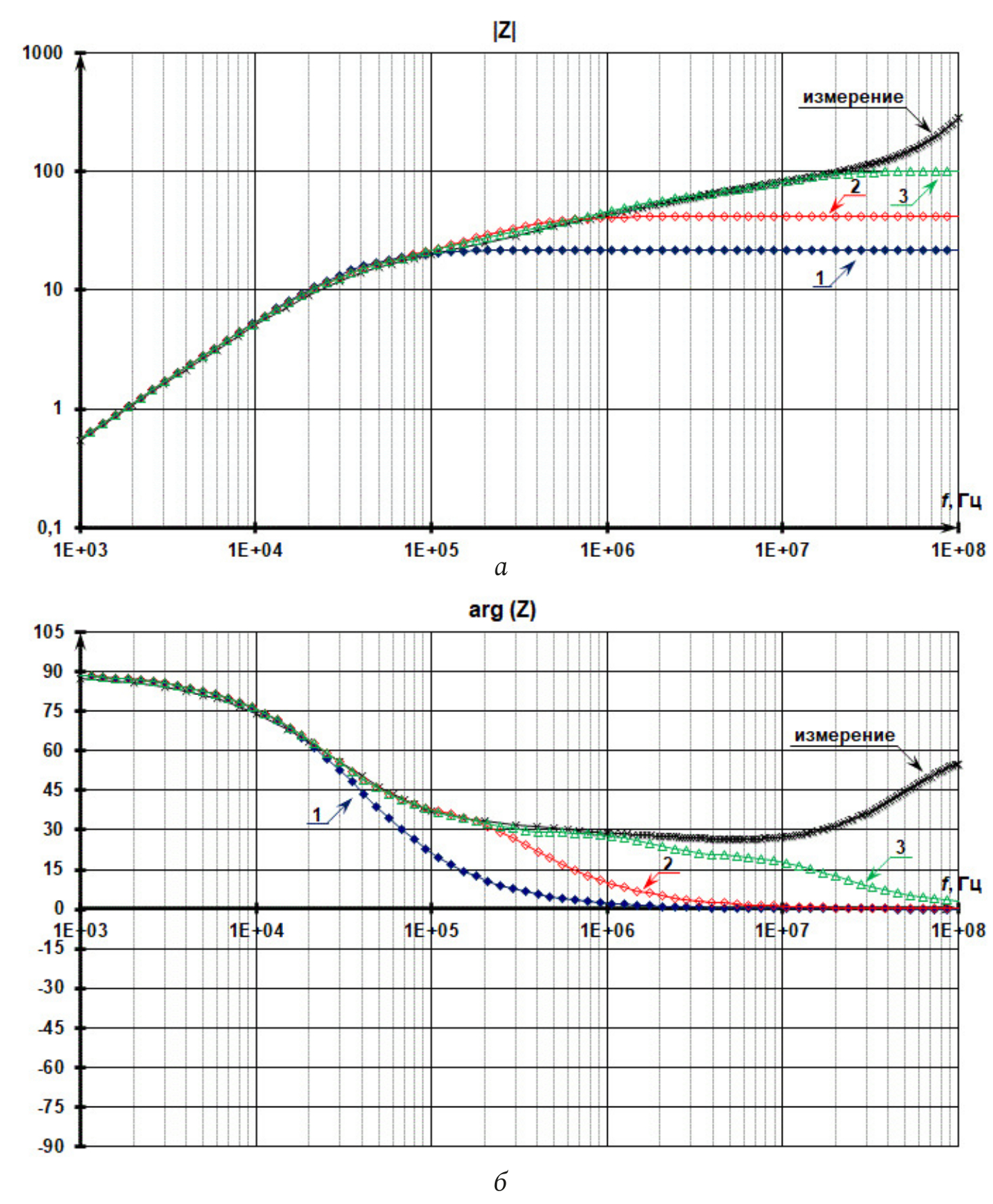 Рис. 11. Модуль (а) и фазы (б) комплексного сопротивления дросселя: измеренное значение в сравнении с различными схемами замещения: 1) рис. 10, а, 2) рис. 10, б, 3) рис. 10, в