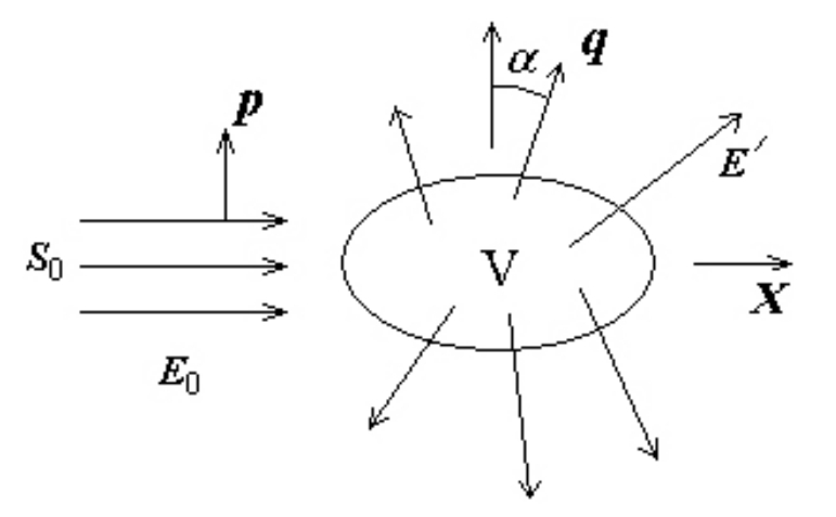 Fig. 1. Scattering of a plane electromagnetic wave (Poynting vector) by volume V with turbulent pulsations