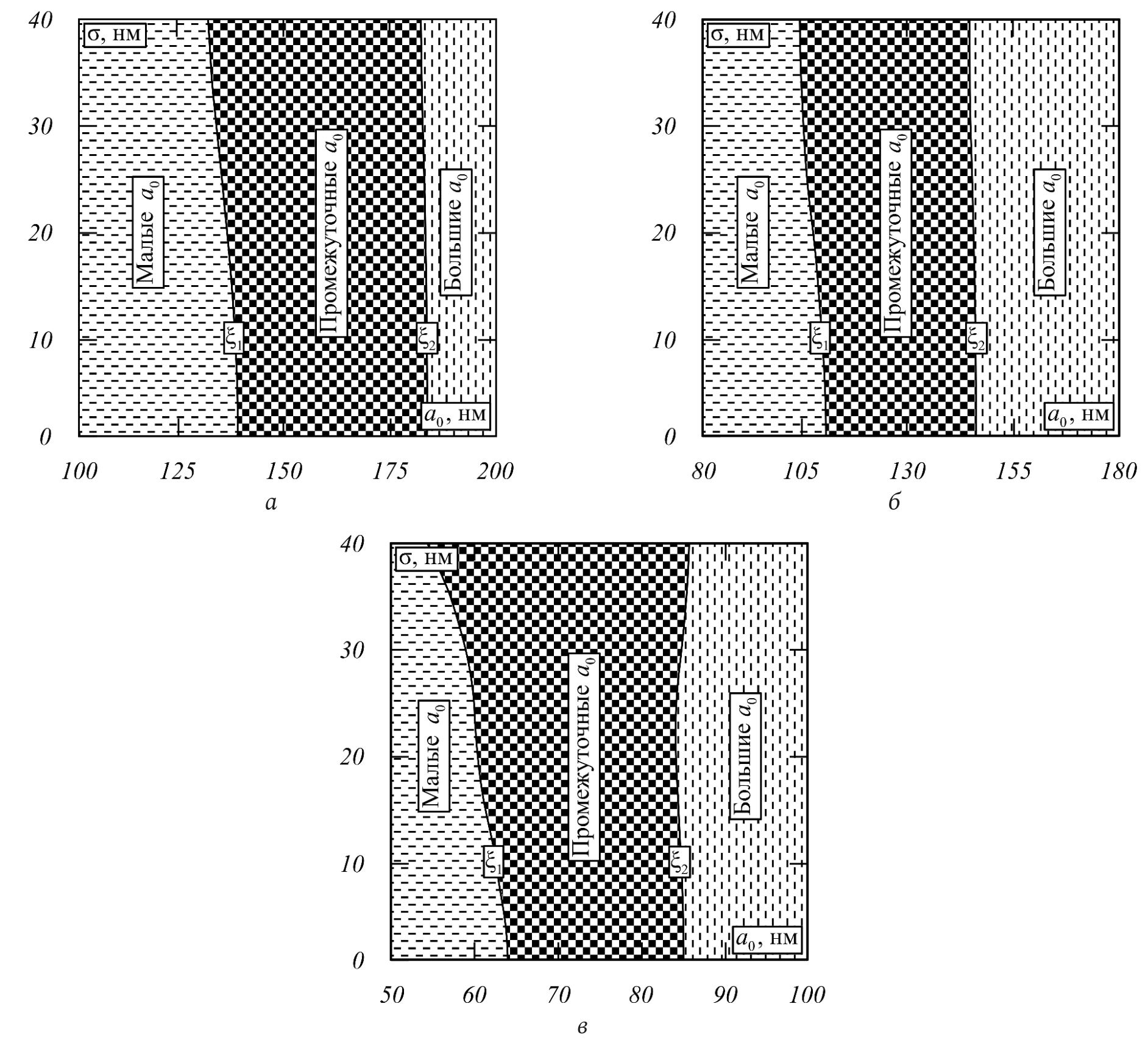 Рис. 2. Области средних радиусов наночастиц в зависимости от их среднего радиуса и среднеквадратичного отклонения при (а), 2 (б) и 10 мм (в)