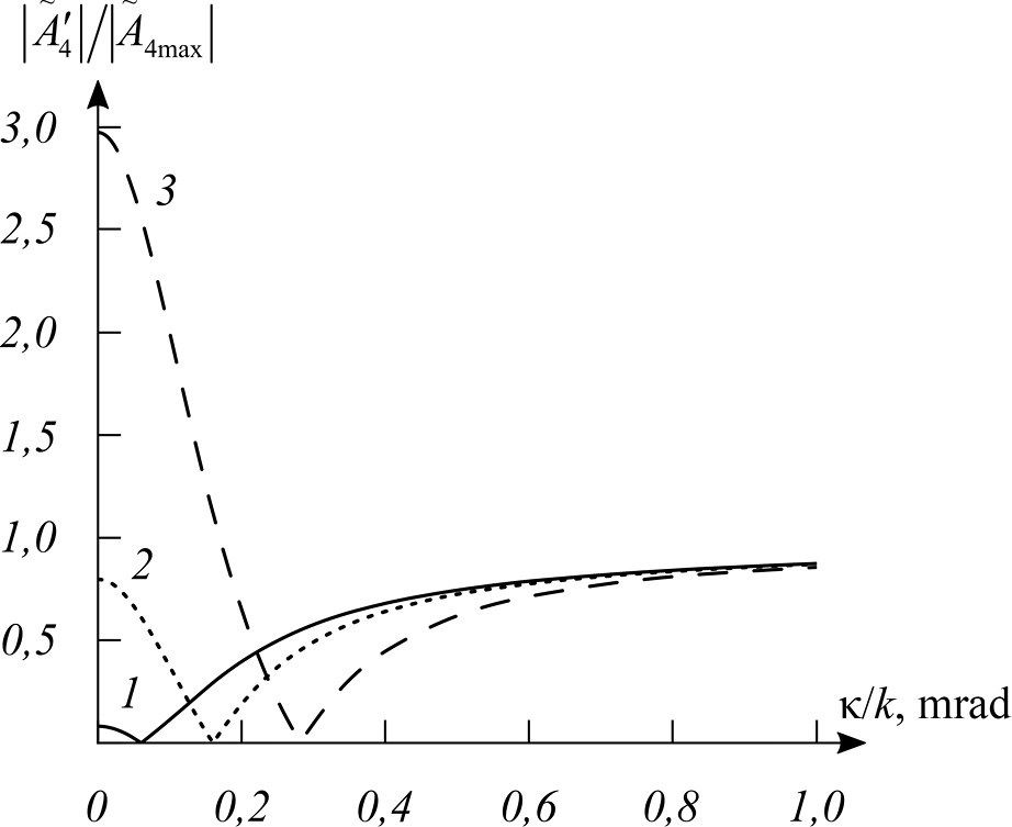 Анализ выражения (3) показывает, что при фиксированной толщине нелинейной среды вид пространственного спектра объектной волны в основном определяется средним радиусом наночастиц. Поэтому будем говорить о пространственных спектрах, для которых и как о спектрах, соответствующих малым, промежуточным и большим средним радиусам наночастиц. Так, модули пространственных спектров объектной волны, приведенные на рис. 1, соответствуют диапазонам малых (кривая 1), промежуточных (кривая 2) и больших (кривая 3) средних радиусов наночастиц.