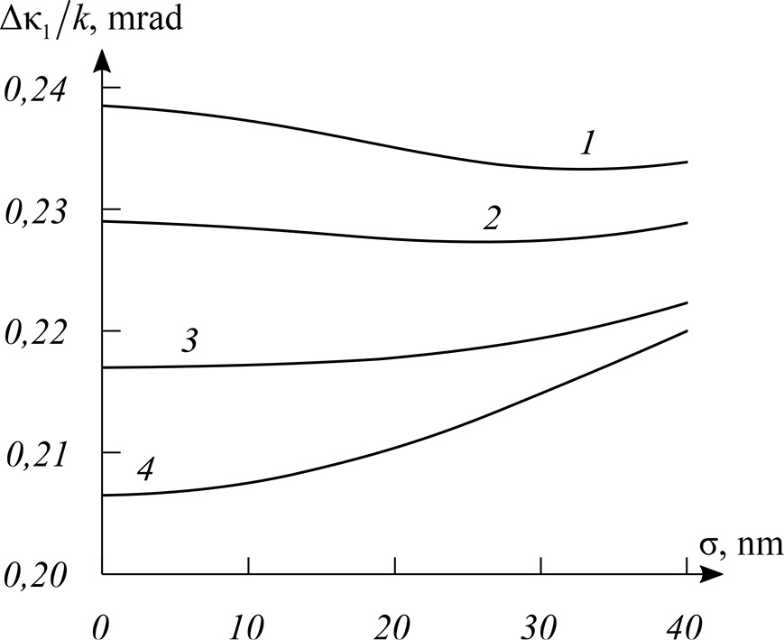 Рис. 3. График зависимости полуширины полосы вырезанных пространственных частот от среднеквадратичного отклонения при мм, (1), 110 (2), 120 (3), 130 нм (4)