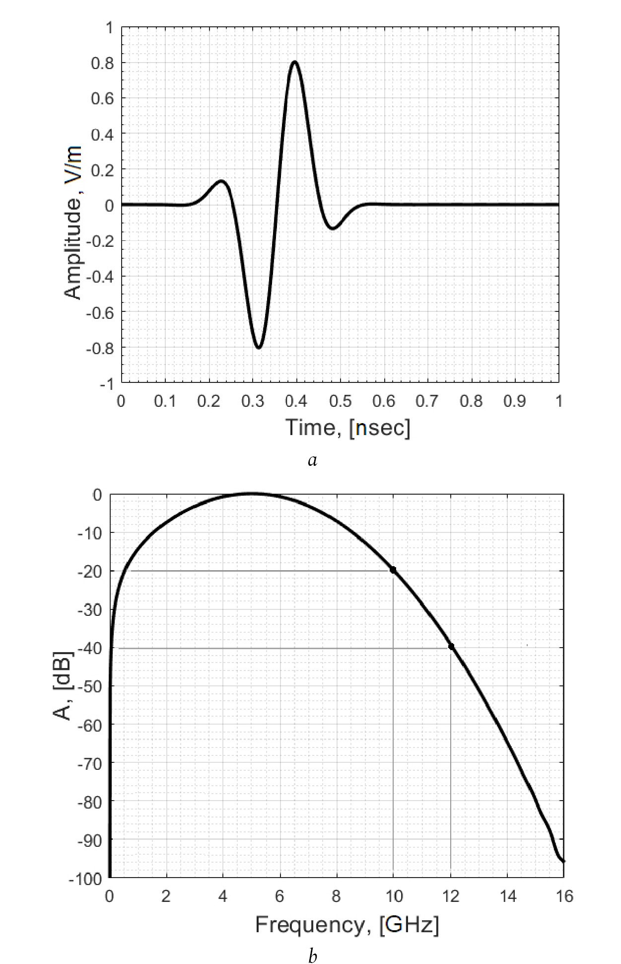 Because of the need to limit the frequency band in the FIT, a bipolar Gaussian ultra-wideband (UWB СШП) ultrashort pulse (Fig. 5a) with a spectrum from 1 MHz to 10 GHz at a level of −20 dB and up to 12 GHz at a level of −40 dB was used to excite a plane wave in the simulation (Fig. 5b).