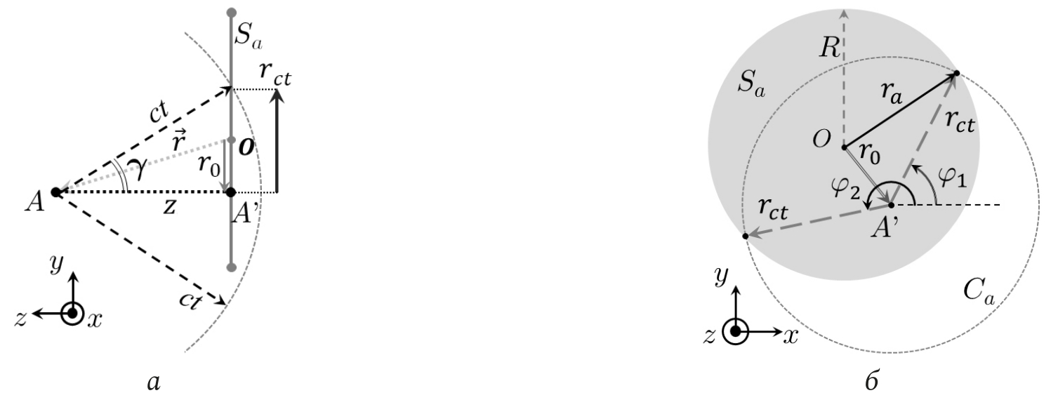 Рис. 2. Апертура и воображаемая сфера с радиусом ct (а); апертура контур интегрирования и угол (б)