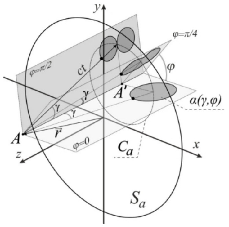 Для сверхширокополосных импульсных сигналов удобнее работать с временным представлением сигнала. Как показано в [6], можно предположить, что каждая точка апертуры излучала δ-импульс в момент времени . Первообразная импульсной характеристики (ПИХ) в точке может быть получена в следующем виде [6]: