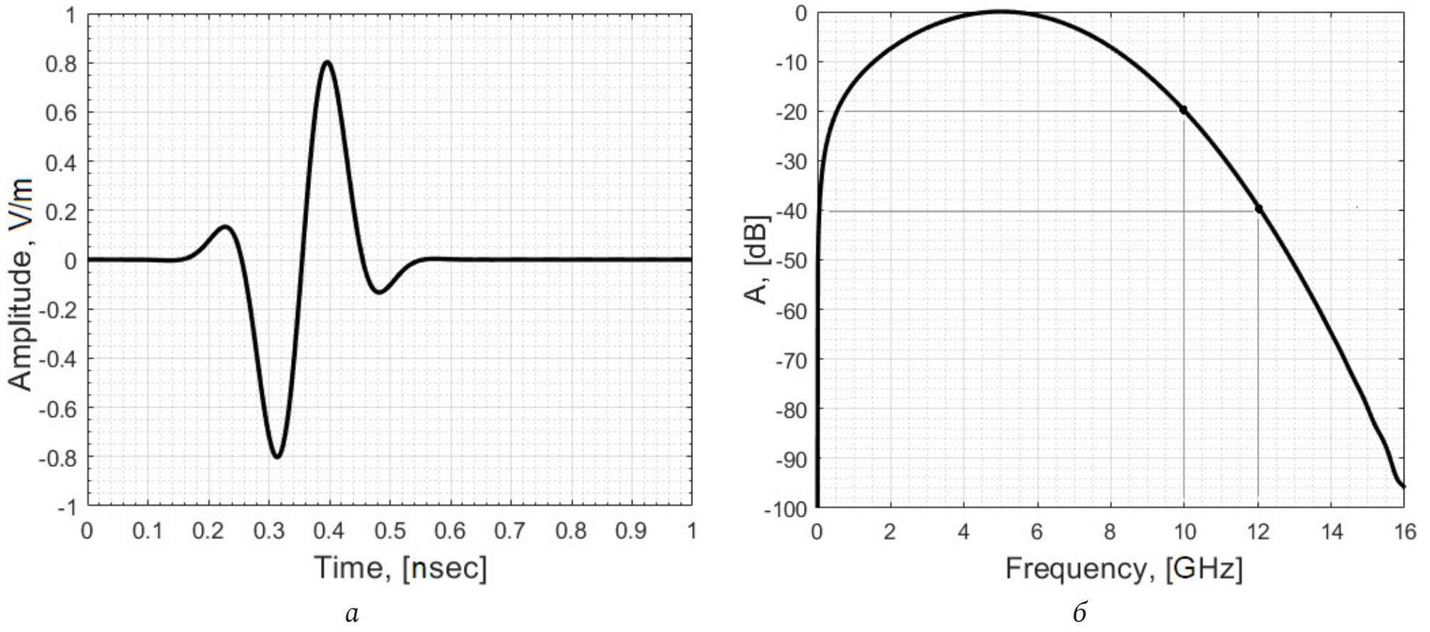 В связи с необходимостью ограничения полосы частот в методе FIT для возбуждения плоской волны в моделировании использовался биполярный гауссовский сверхширокополосный (СШП) ультракороткий импульс (рис. 5, a) со спектром от 1 МГц до 10 ГГц по уровню –20 дБ и до 12 ГГц по уровню –40 дБ (рис. 5, б).