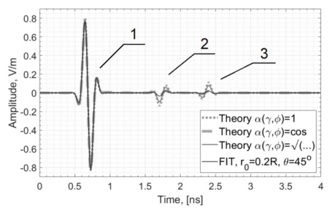 Сравнение сигналов, рассчитанных методом FIT, и предложенным в работе методом показало, что амплитуды второго и третьего импульсов, соответствующих задней части первообразной ИХ, различны. Самая большая разница наблюдается вблизи оси z. Эти отклонения определяются и объясняются диаграммой направленности антенны элементарного излучателя и эффектом, связанным с затеканием токов на границе апертуры. Можно заметить, что амплитуда сигнала на зонде, полученная методом FIT, меньше по сравнению с теоретическими расчетами. Судя по всему, краевые токи на границе компенсируют/уменьшают вторичные импульсы.