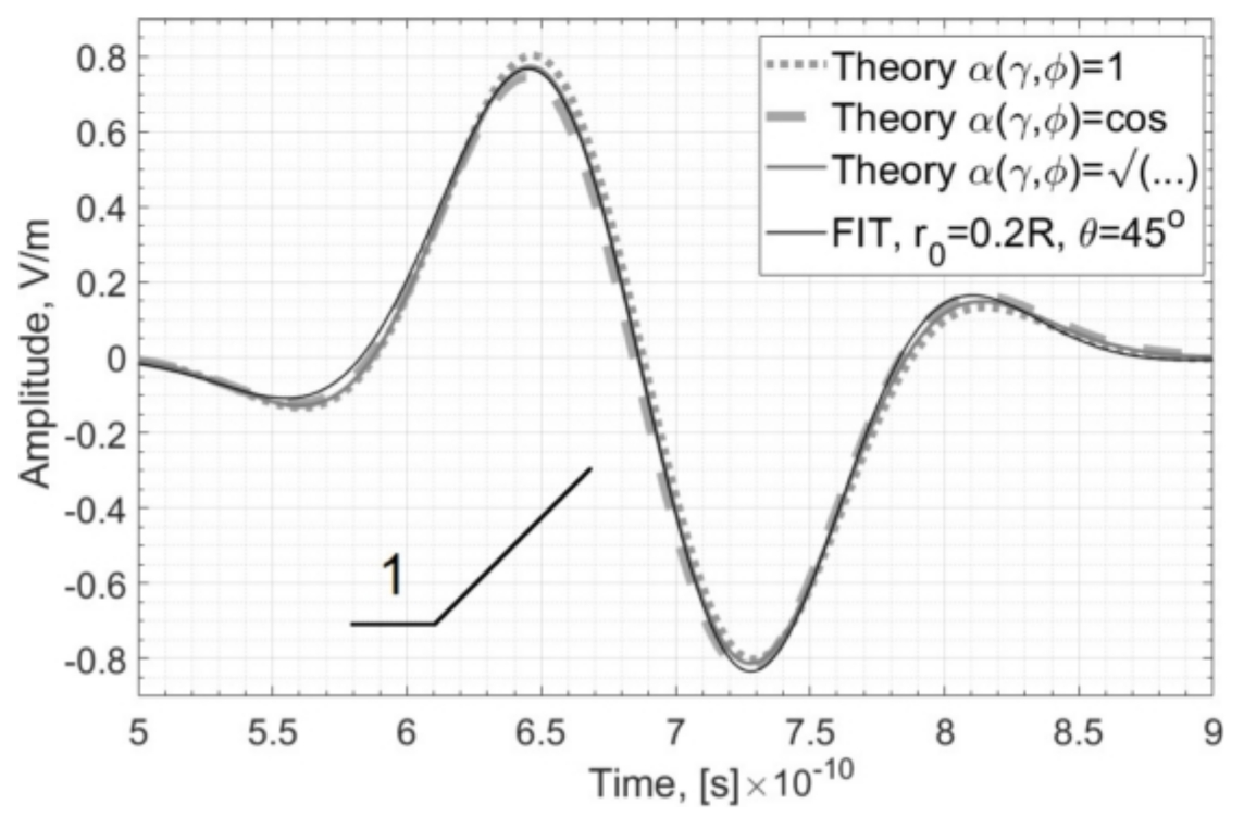 На рис. 7 показан увеличенный вид основного импульса, представленного на рис. 6. Здесь видно, что основная форма импульса практически одинакова для всех поляризационных множителей, что говорит об импульсе основной волны. Однако его максимальная амплитуда и время пересечения нуля в середине (приблизительно 6,9 нс) различны. Разница по максимальной амплитуде импульса, полученного методом FIT, и импульса, вычисляемого по формуле (11), составляет около 0,5 %, для «косинусного» поляризационного множителя эта разница будет около 2,5 %, а для изотропного излучателя – около 4 %.