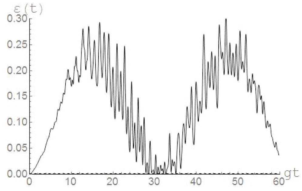 Figure 1 presents the negativity as a function of dimensionless time gt for the coherent initial state of Eq. (3) with and the incoherent initial state of qubits of the form The parameter of the dipole–dipole interaction of qubits is chosen as The average number of photons is The figure clearly shows that the initial coherence of qubits substantially increases the degree of entanglement of qubits, induced by the resonator thermal field, compared with the initial states without coherence. Figure 2 presents the negativity as a function of dimensionless time for the coherent initial state of Eq. (3) with and the incoherent initial state of qubits of the form The parameter of the dipole–dipole interaction of qubits is chosen as The average number of photons is Figures 1 and 2 demonstrate that with increasing thermal field intensity, the maximum degree of qubit entanglement decreases much more strongly for noncoherent initial states.