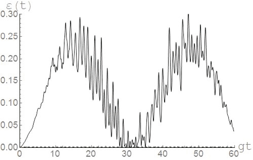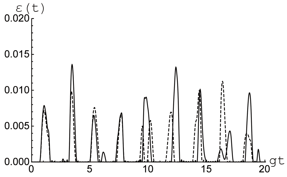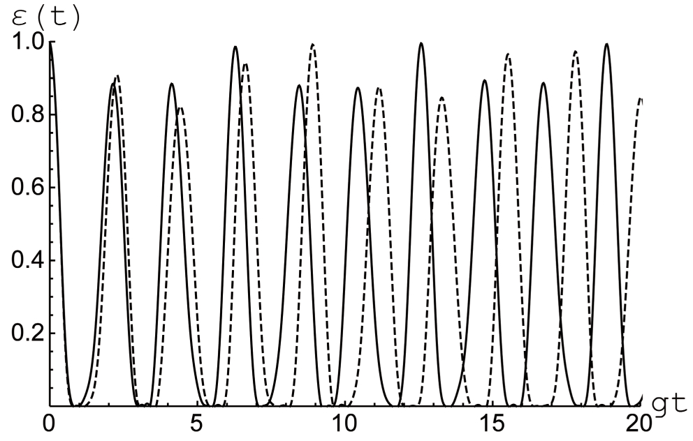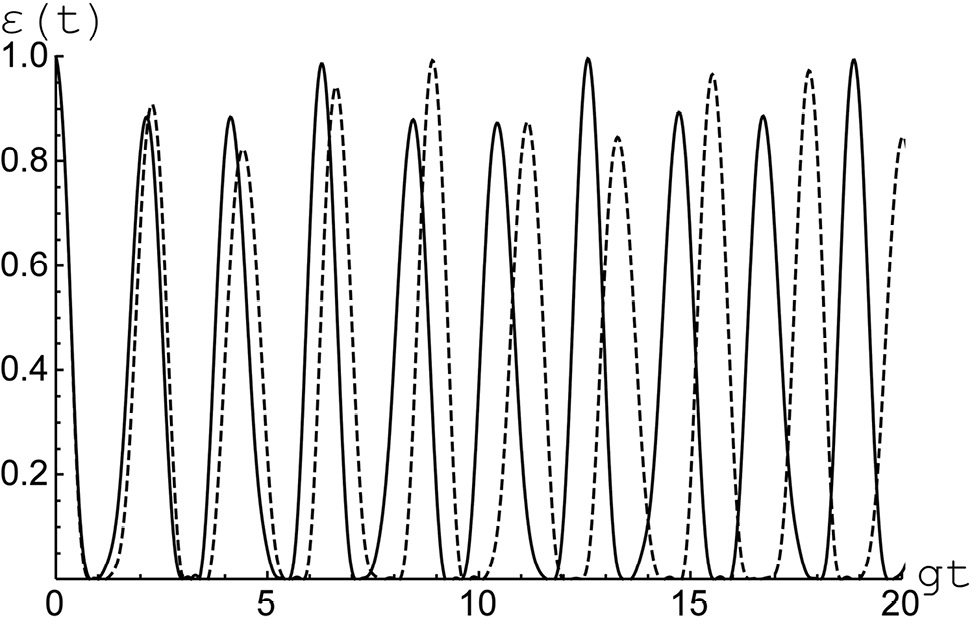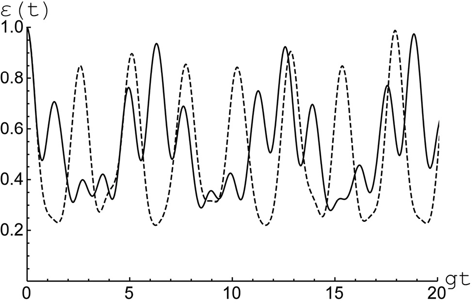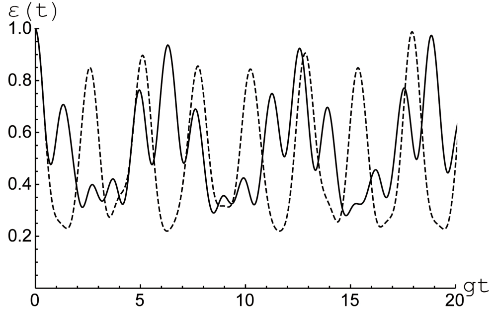 Рис. 5. Отрицательность как функция безразмерного времени для белловского перепутанного (5) с Параметр диполь-дипольного взаимодействия (штриховая линия) и (сплошная линия). Среднее число тепловых фотонов