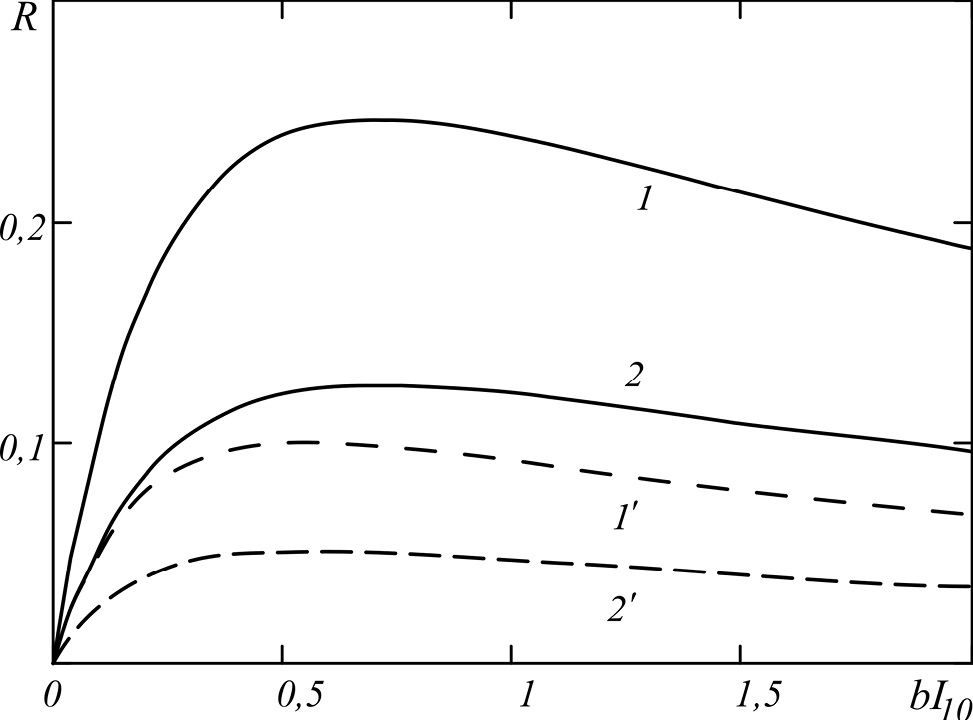 Figure 1, in the approximation of a small reflection coefficient (the transfer of energy from the object wave to the signal wave, self-diffraction of the second pump wave is neglected) under the condition of equal intensities of pump waves on the faces of the nonlinear layer where presents the characteristic dependence of the reflection coefficient on the normalized intensity of pump waves in the presence (curves 1', 2') and absence (curves 1’ and 2’) of feedback for the object and signal waves. With increasing intensity of the pump waves, the reflection coefficient increases, reaches its highest value, and then slowly decreases. At the optimal value for the intensity of the pump waves the reflection coefficient takes the maximum value.