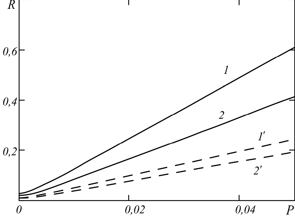 Fig. 2. Dependence of the reflection coefficient of a four-wave radiation converter on the parameter P at (1, 2), (1, 2)