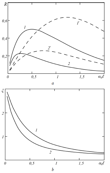 Fig. 4. Dependence of the reflection coefficient (a), difference in the reflection coefficients (b) on the absorption coefficient at (1, 2), (1, 2),