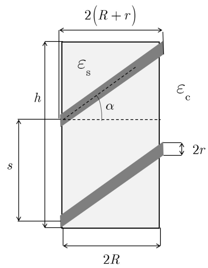Рассмотрим киральный метаматериал (КММ), представляющий собой равномерную матрицу из тонкопроволочных проводящих однозаходных спиральных элементов, расположенных в однородном диэлектрическом контейнере с относительной диэлектрической проницаемостью Будем считать, что спиральные элементы намотаны вокруг цилиндров с относительной диэлектрической проницаемостью и их высота равна высоте кирального метаматериала Метаматериал имеет геометрические размеры вдоль трех координатных осей и соответственно. Период матрицы из спиральных элементов определяется радиусом витка спирали (цилиндра) и расстоянием между центрами цилиндров При постановке задачи считается, что периоды вдоль осей и равны между собой.